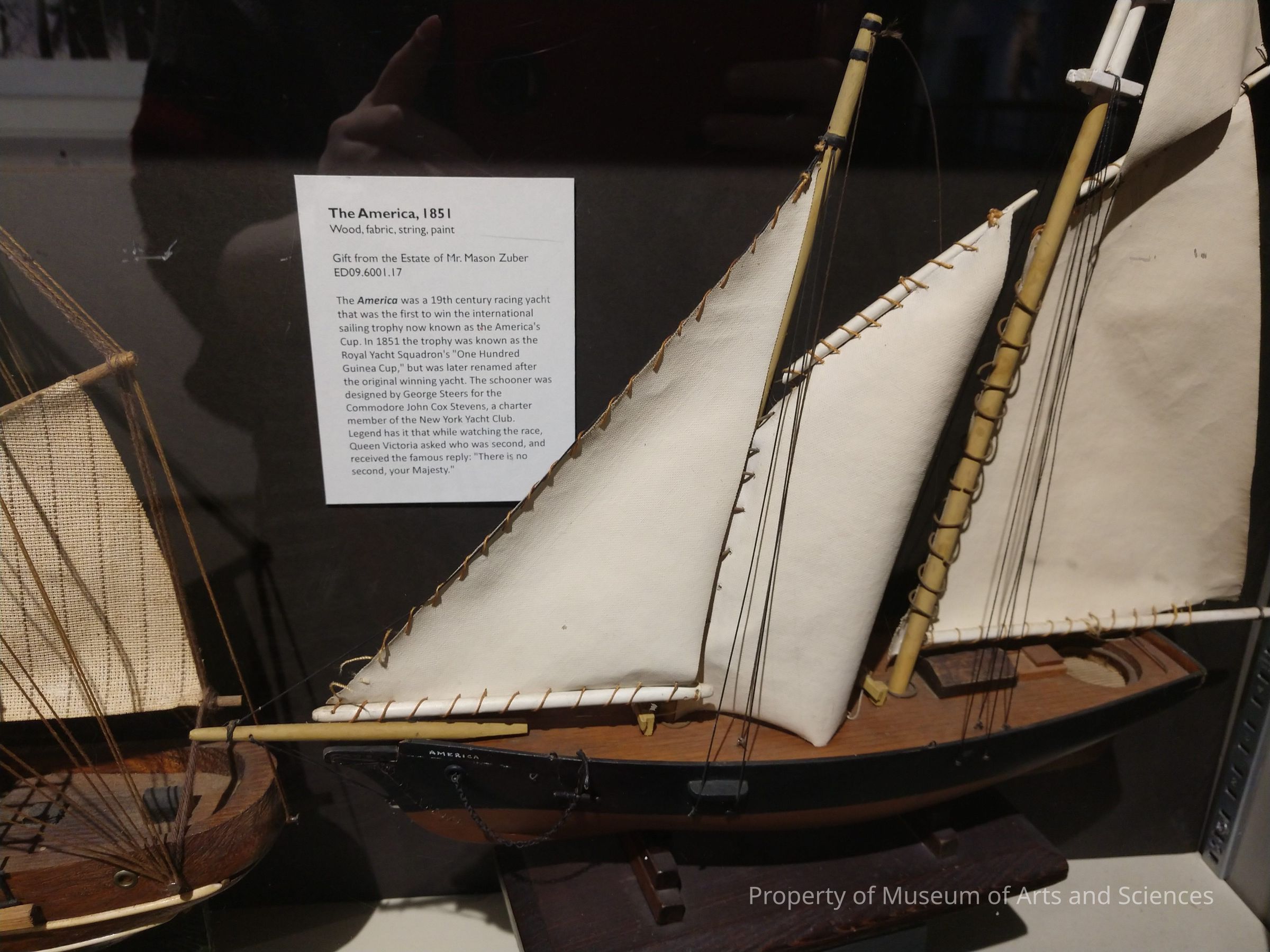 Model ship has three sails which are up; unpainted wood except for wide black strip around top of hull; it is on a stand.Collection