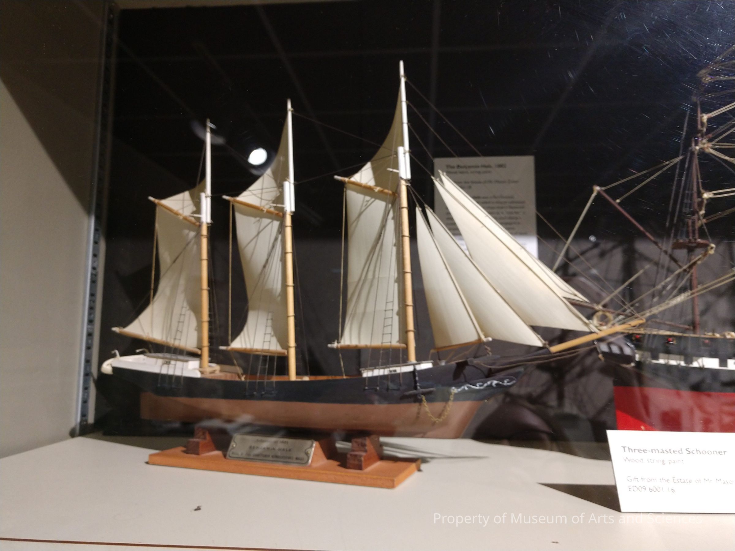 Model boat is painted black at the top of the hull, otherwise unpainted; sails are all up; ship is on stand which carries its name.Collection