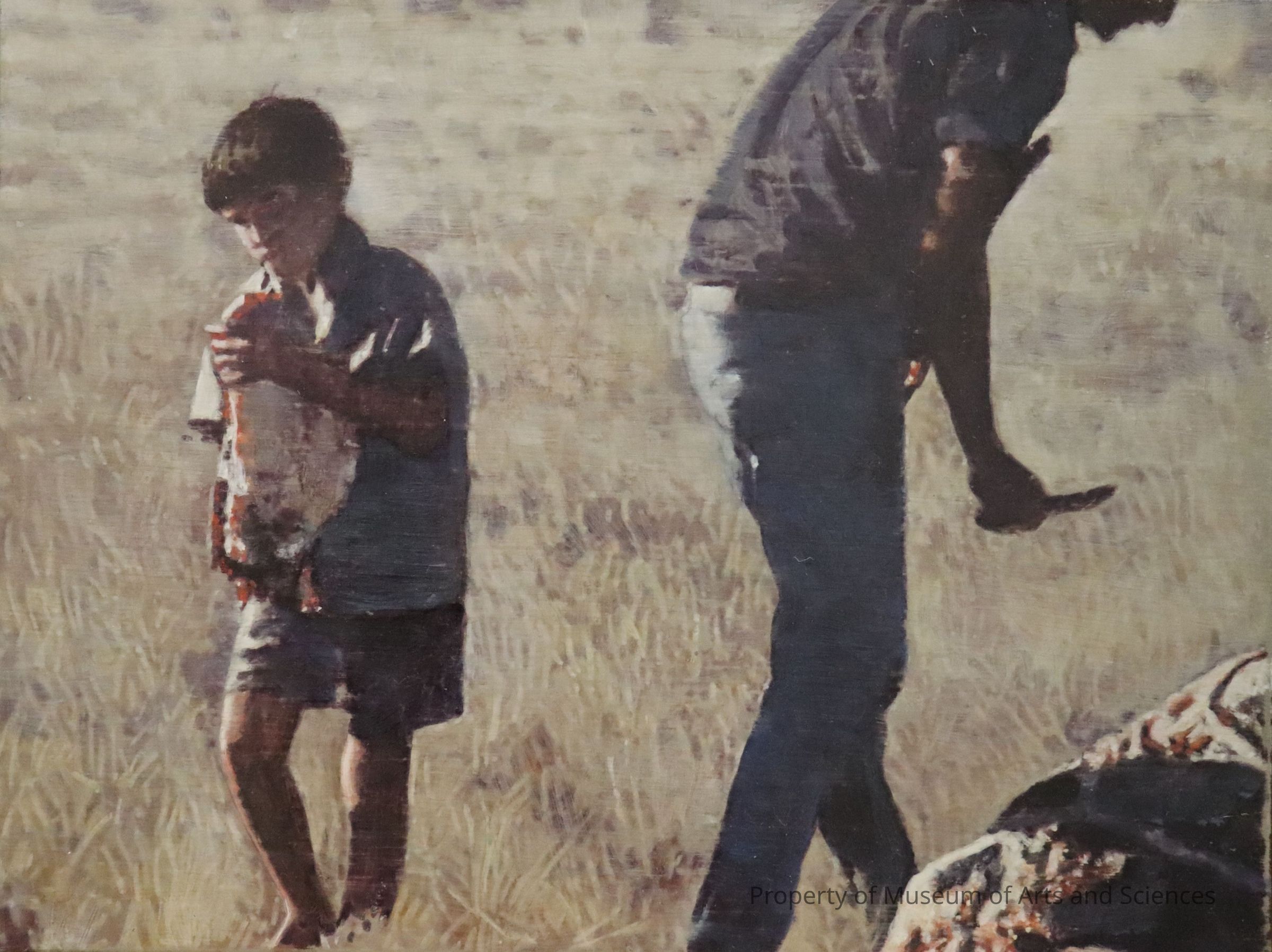 Man with knife. Boy holding severed cow head? Cow carcass bottom right corner. Grassy field with no sky.Artwork Details