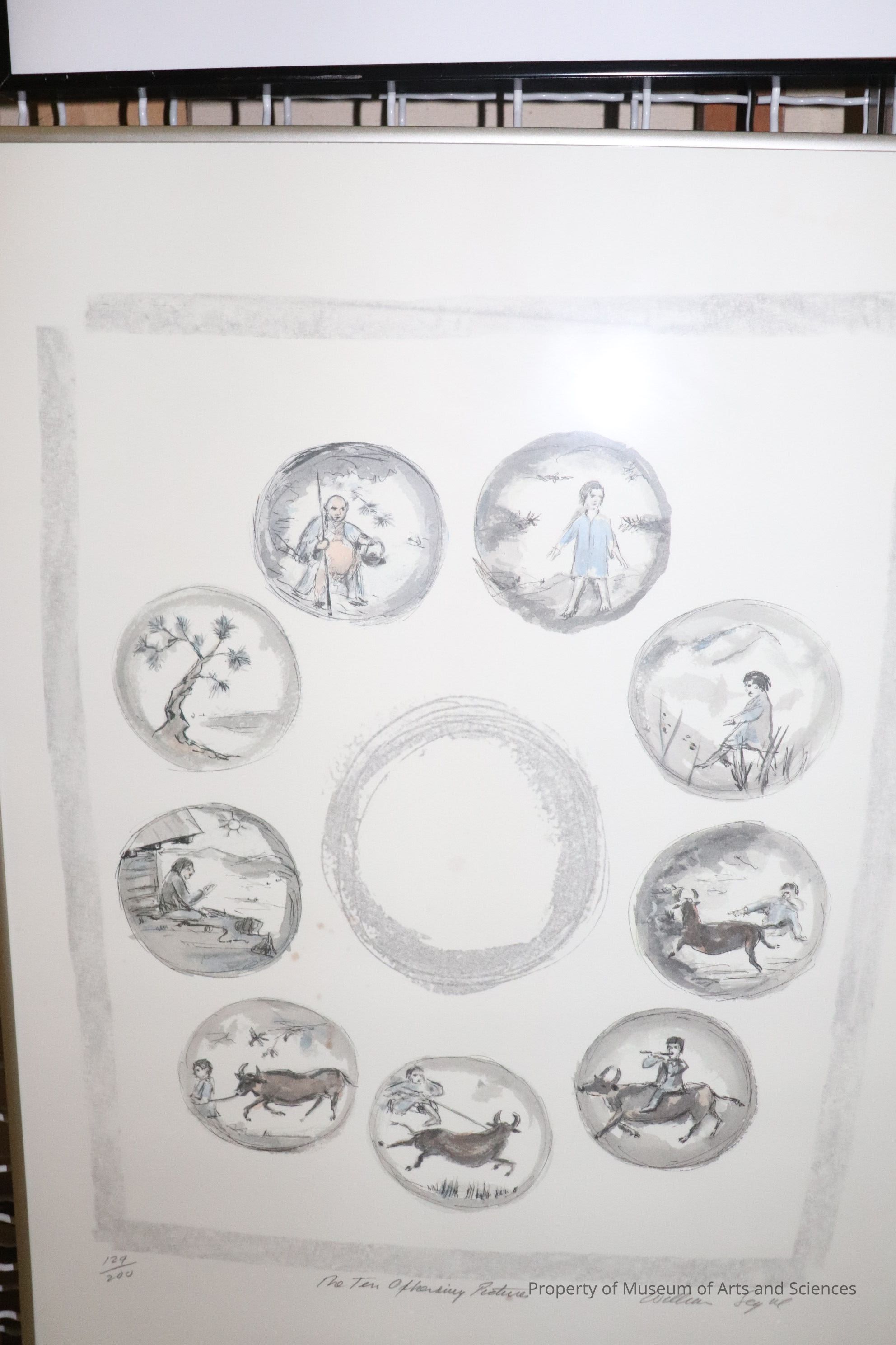 "the Ten Ox Herding Pictures", is an ancient Japanese Buddhist text/poem that describes the awakening process and the process of attaining consciousness. Throuch a series of circular ink and watercolor paintings, Segal relies on the originals painting in Japan during the Kamakura period (1185-1333). The lesson is divided into ten stanzas and illustrated per stanza. One may read translations of the poem and see the orginal works in the metropolitan Musuem of Art in New York where Segal lived. The lessons are widely taught and known as Buddhist parables to raising one's consciousness.Artwork Details