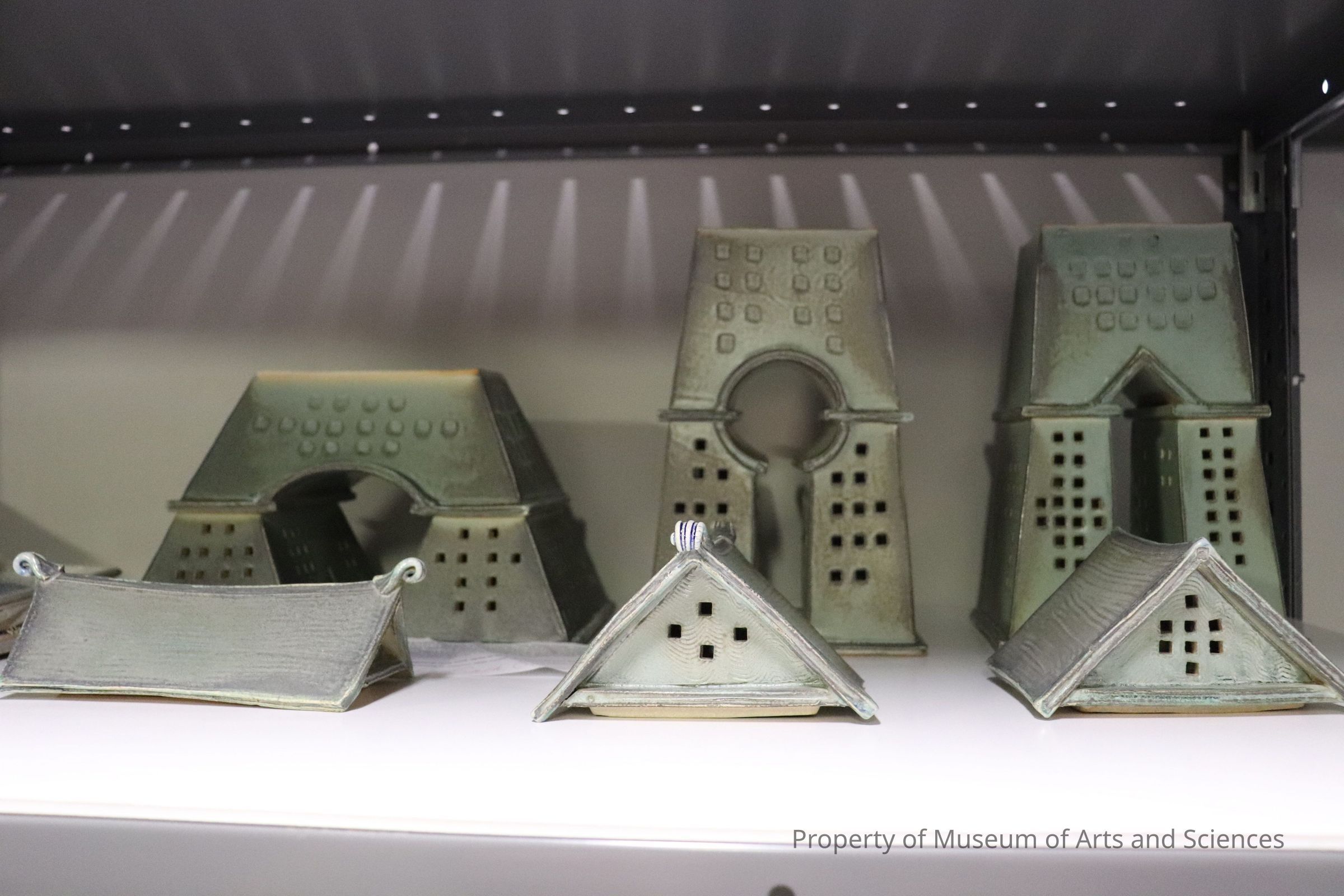 Three house-like sculptures. Each w/ lid.