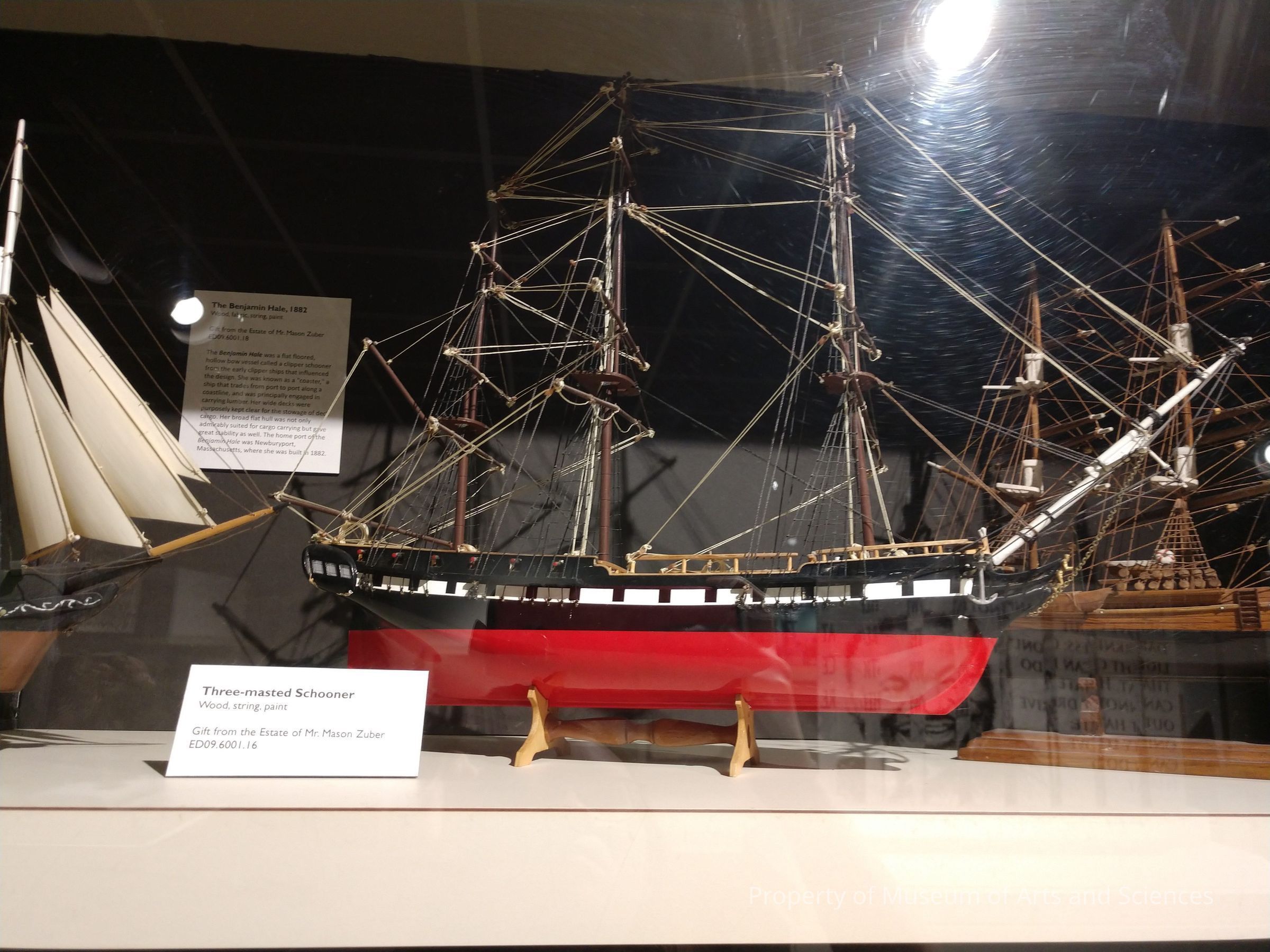 Three-mast, no sails, red keel clipper. Ship's hull is painted red, white, and black. Deck is unpainted; from Japan. Miniature brown pulley sitting between two cargo hatches. Ship rests on its stand.Collection