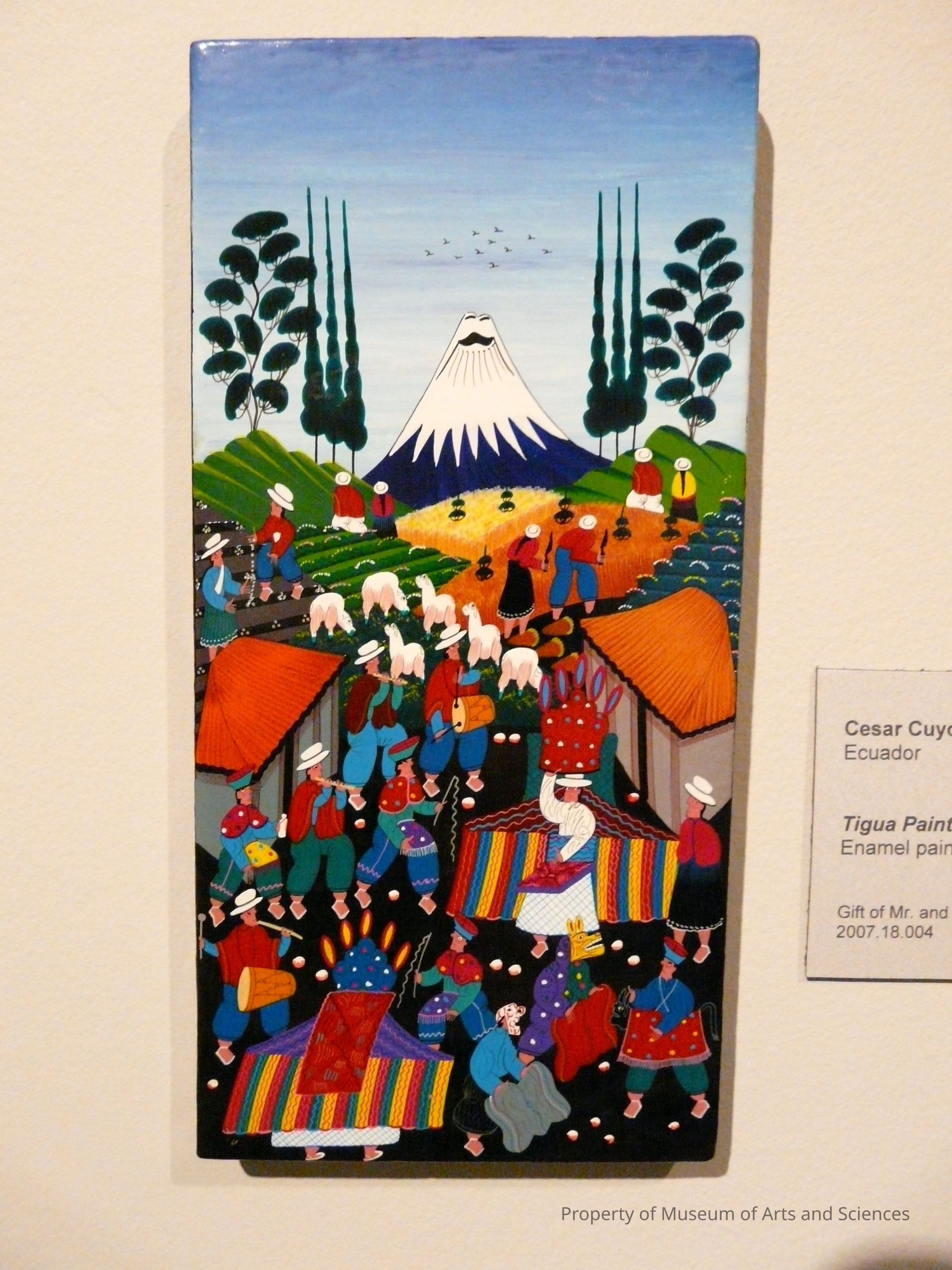 Typical village scene showing village in mid section on left with domestic scene in the mid upper section. Also seen are sheep and llama herds with snow-capped volcano in the backgorund. Flying in the upper center left is the image of a condor with a young women aside his back. This figure represents the legend, El Condor Enamorado, which appears in tigua paintings. The frame surface is painted in polychrome geometric designs.Artwork Details