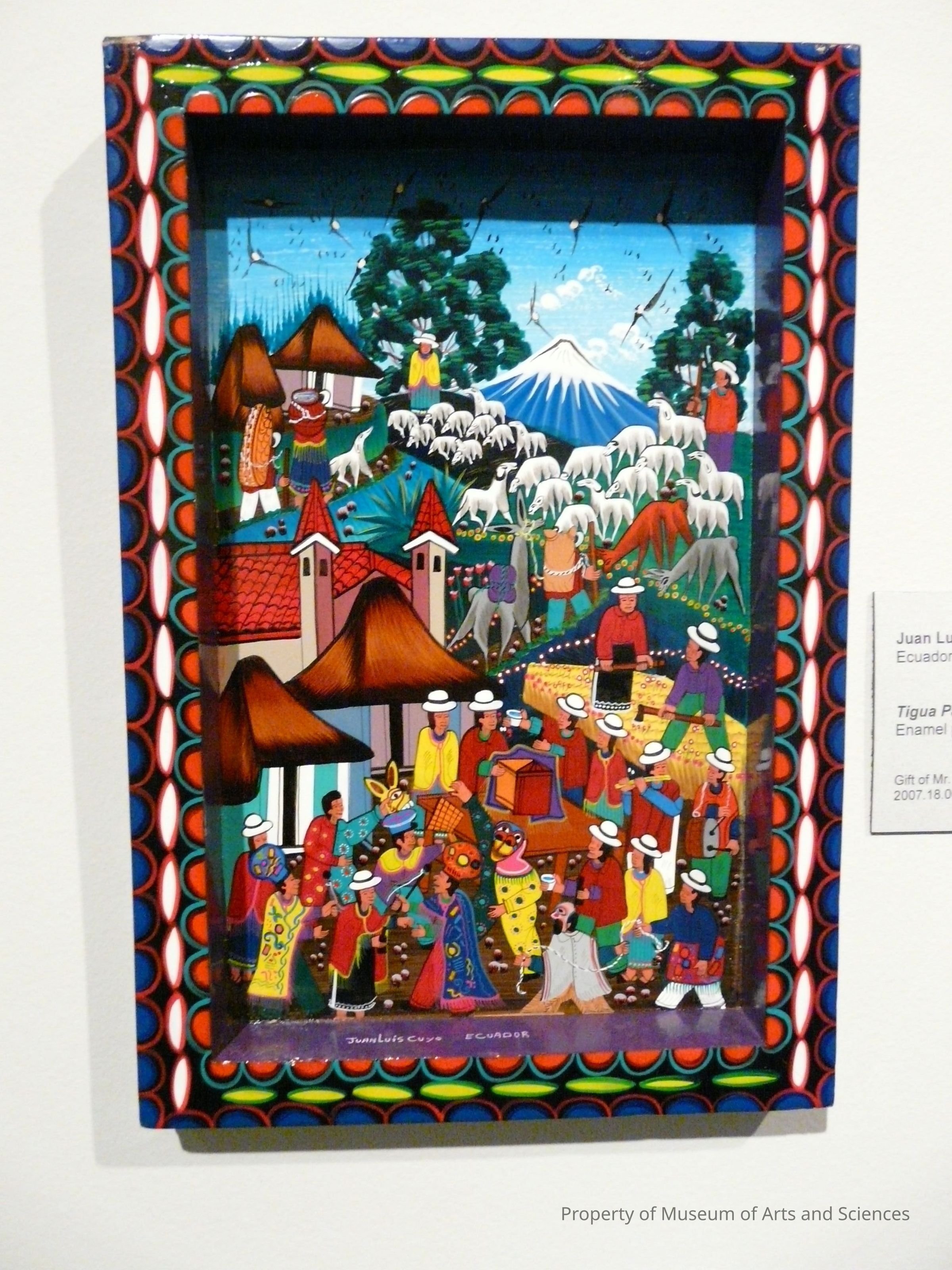 Typical village scene with bright colors depicting a street festival (corups Chisti) in Foreground. There are farm workers in mid ground, tending fields of barley and produce with a herd of goats nearby. Quilotoa, an extinct volcano, is looming in the upper background. It is indentified by its crater lake. It is surrounded by lush green fields and a light blue sky.Artwork Details