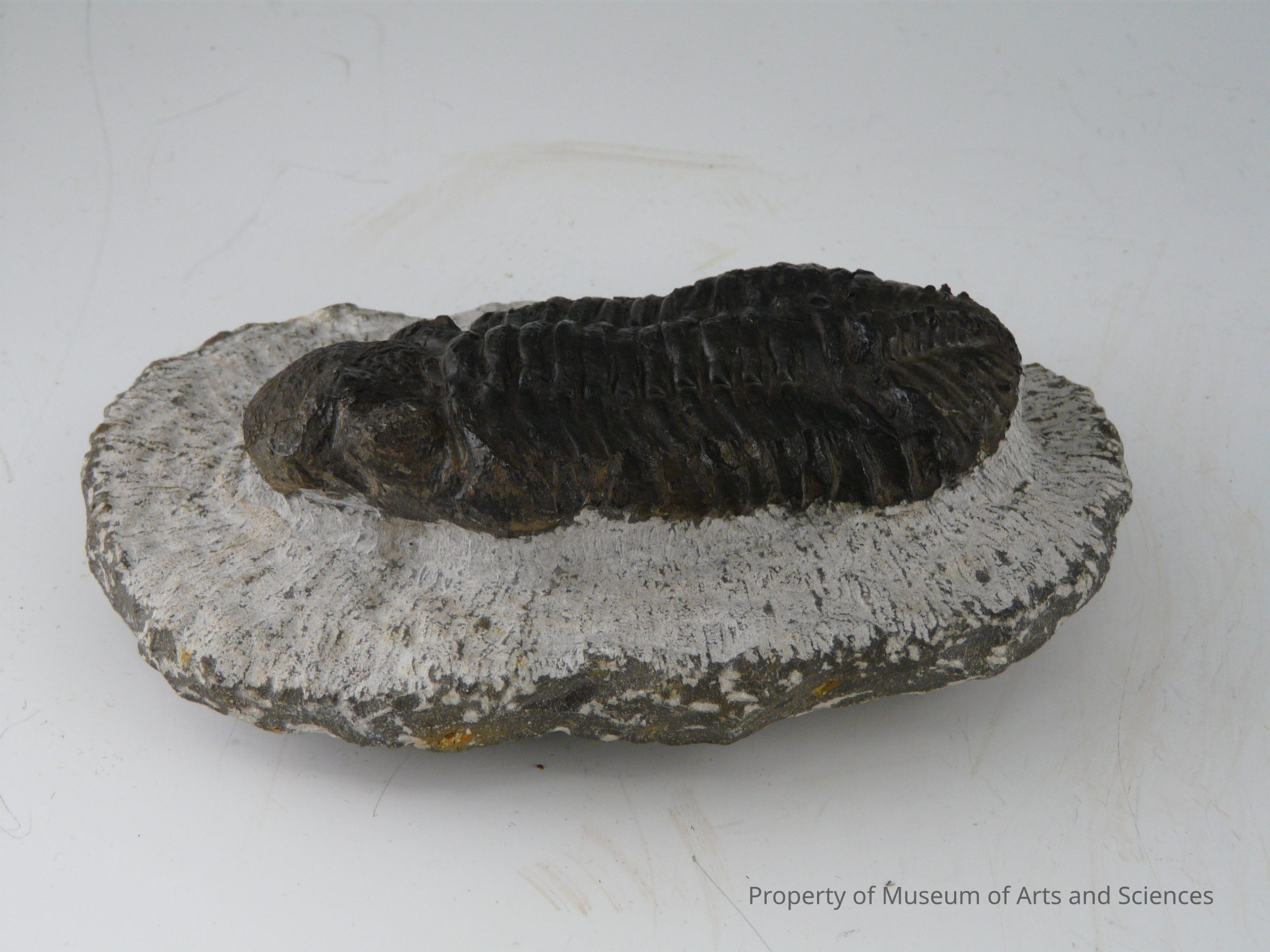 Fossilized trilobite excavated from matrix stone. Slightly distorted postiion. Chip mark on back.Collection