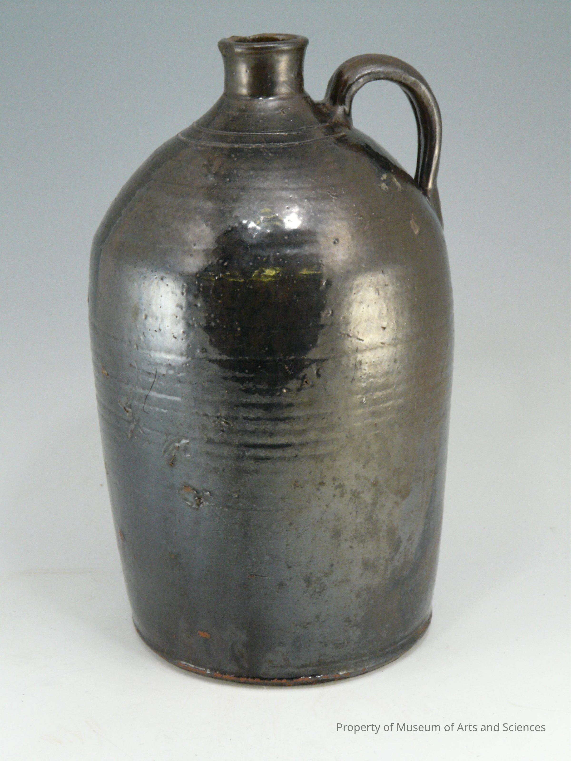 two gallon jug with one handle, metallic glaze, two incised lines at base of neckArtwork Details