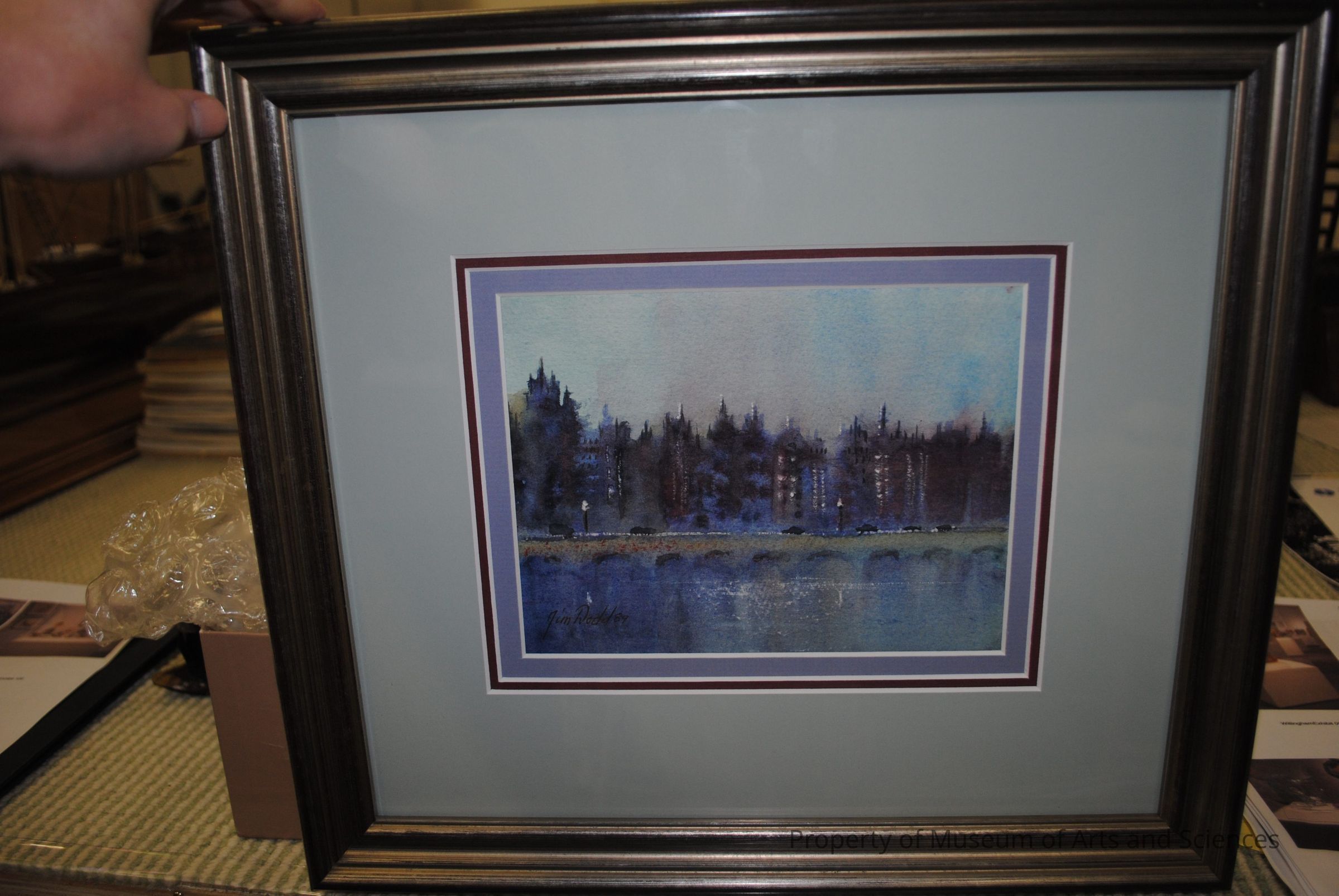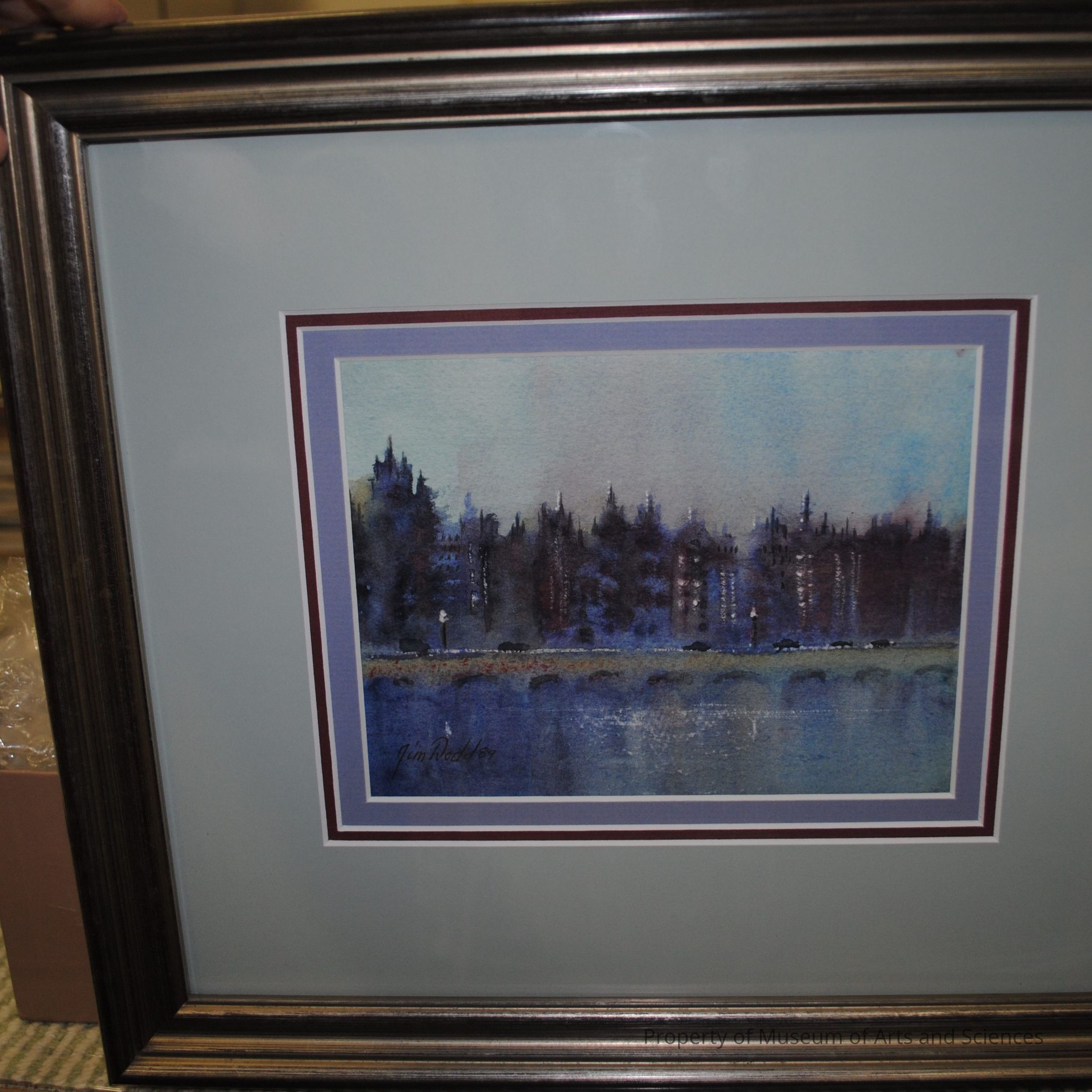 One framed and mounted original watercolor painting; city street scene with cars on bridge; dated 1989 and signed Jim Dodd in lower left corner.Collection