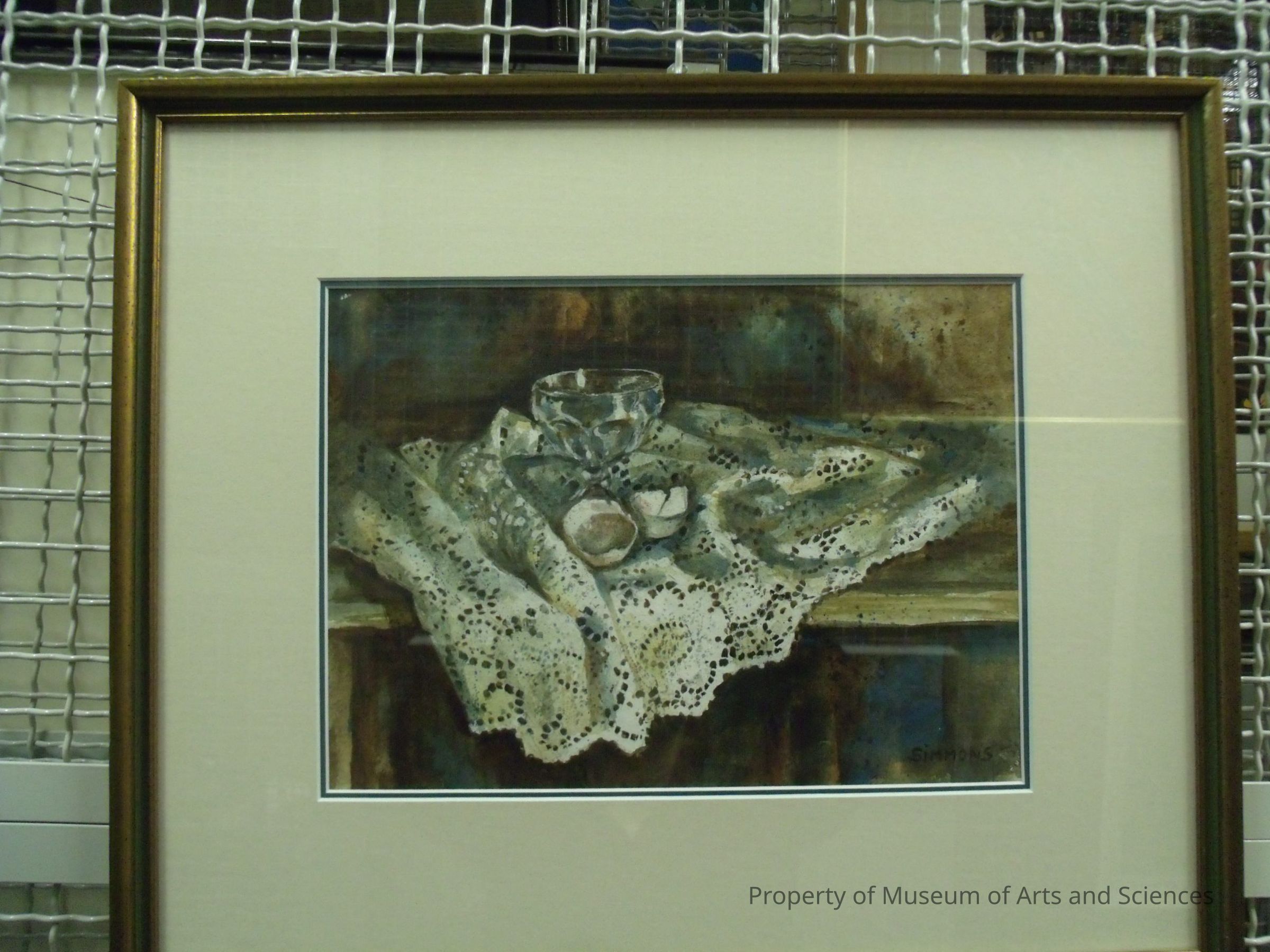 One framed and mounted original watercolor painting of lace with egg shells and bowl by Eugenia Simmons, a Macon artist known for her lace paintings'; signed Simmons in lower right corner. Framed dimension: 19"x 23.5"Collection