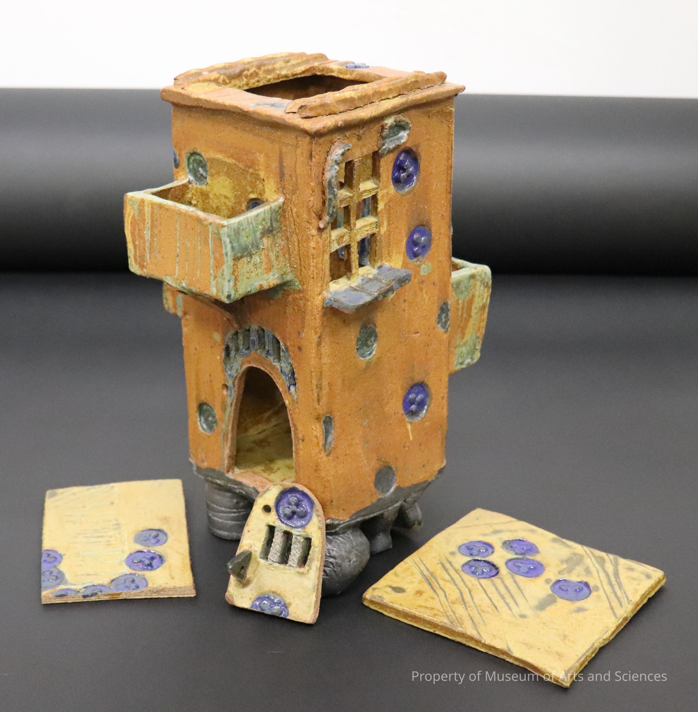 Terracotta-colored stained tall house with slatted windows and 3 balconies. 2 removable roof slabs and door.Artwork Details