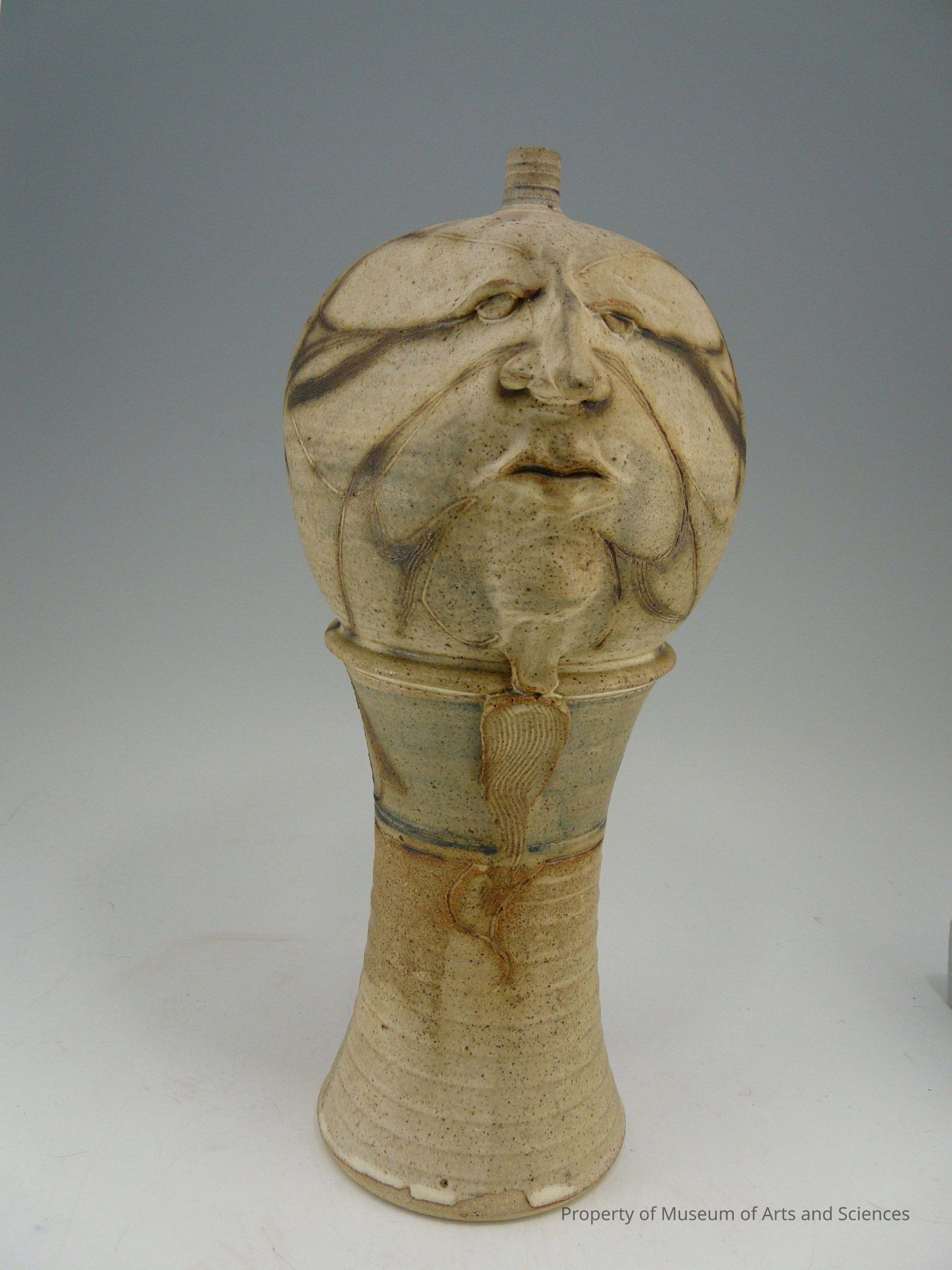 Tall jar-like sculpture with a face on each side. Base is tapered like a wineglass stem.Collection