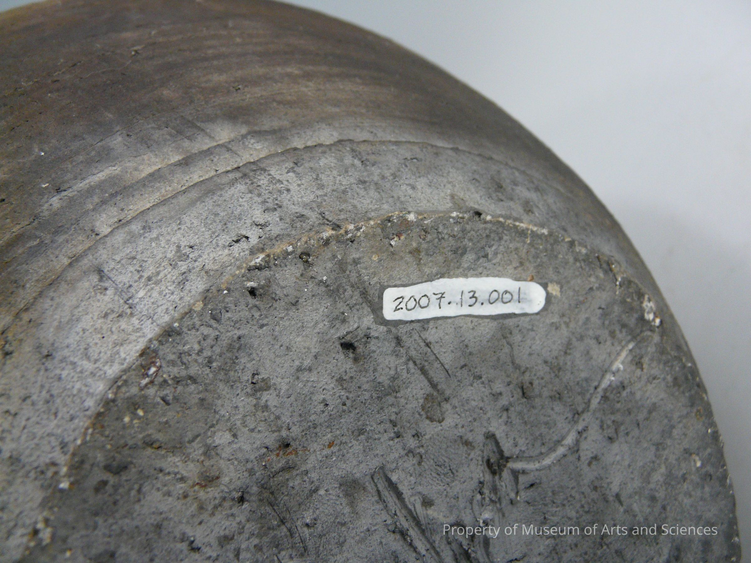 Large open mouthed. Slightly everted rim. Wings for handles. Soft grey color. 14"hx12"w.Collection