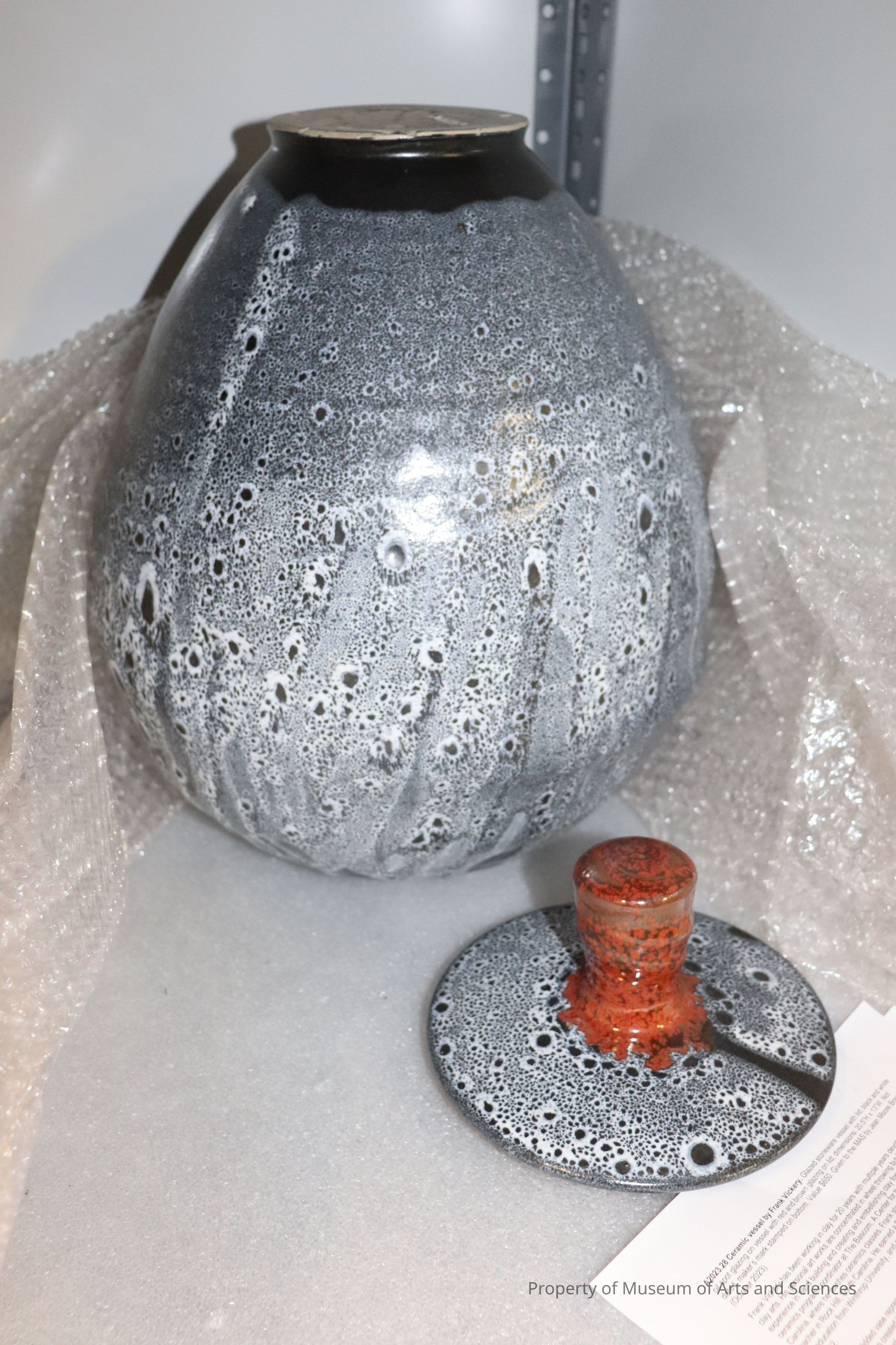 Black and white oil spot glazed vessel. Red and brown oil spot glazed lid.