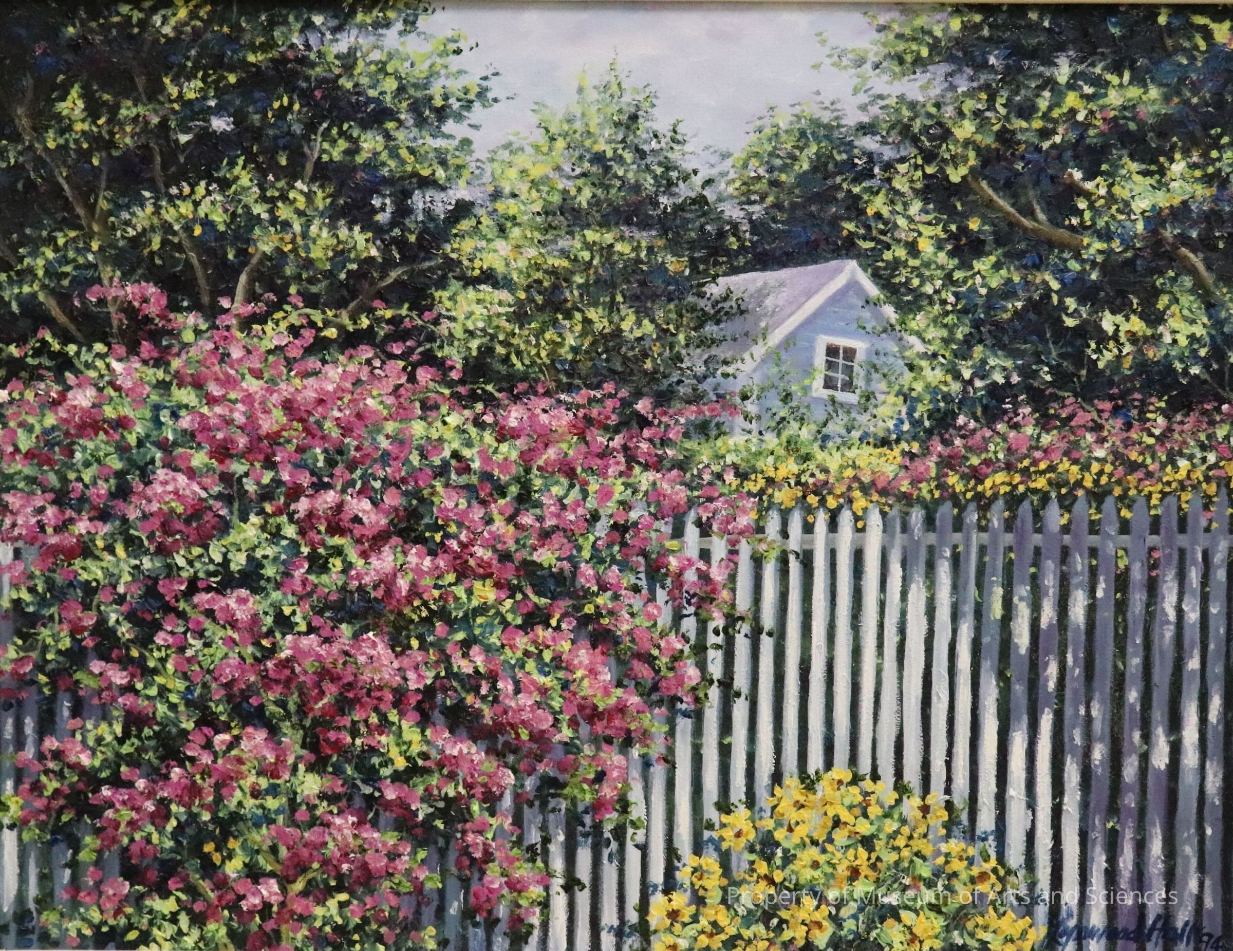 A profusion of pink and yellow flowering vines, shrubs, and trees are feature falling over and behind a white picket fence. A corner of a light blue cottage with white trim can be seen in the backgroundAcquisition