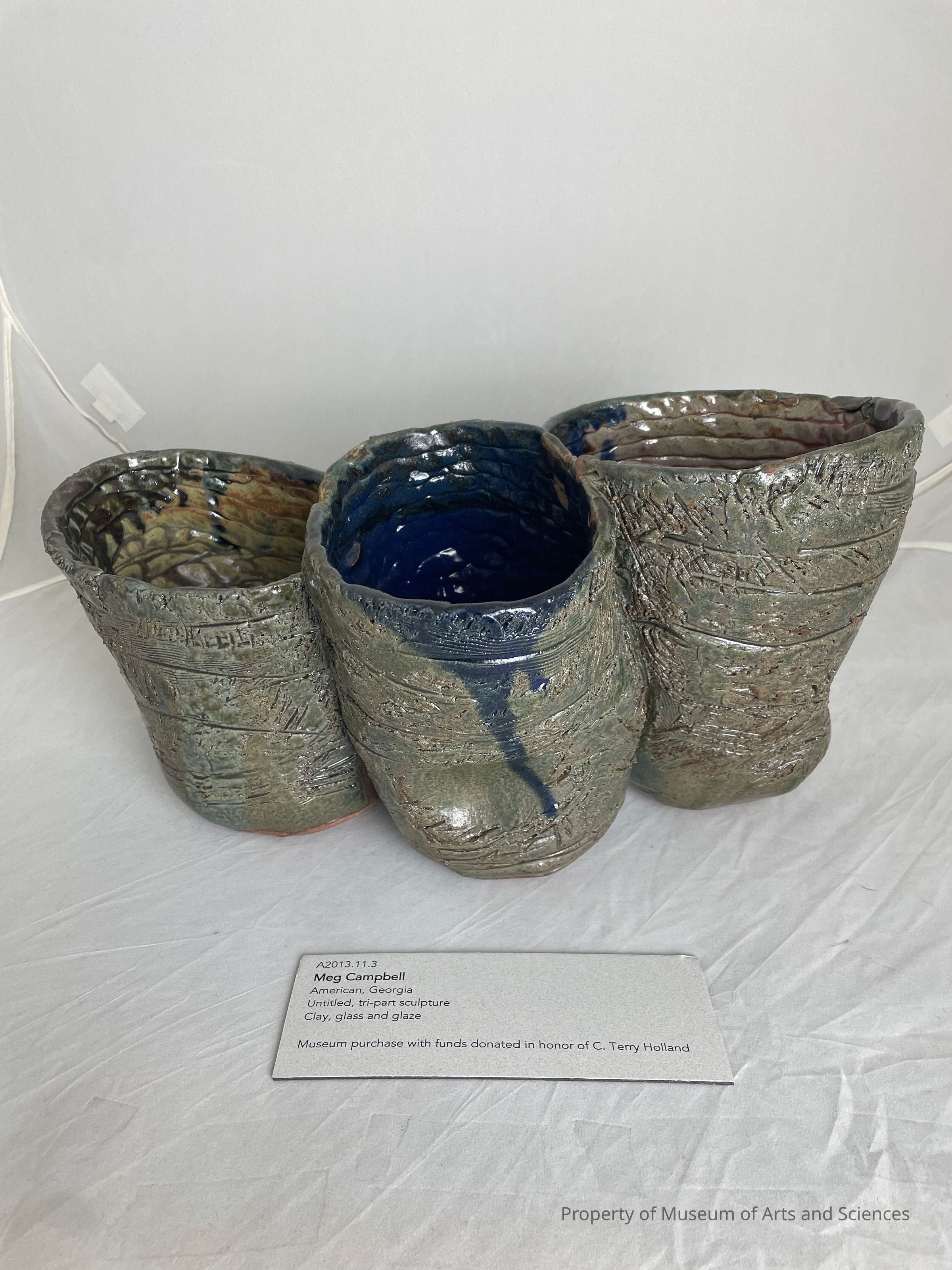 Ceramic tri-part sculpture by Macon-based artist Meg Campbell; clay with glaze.Collection