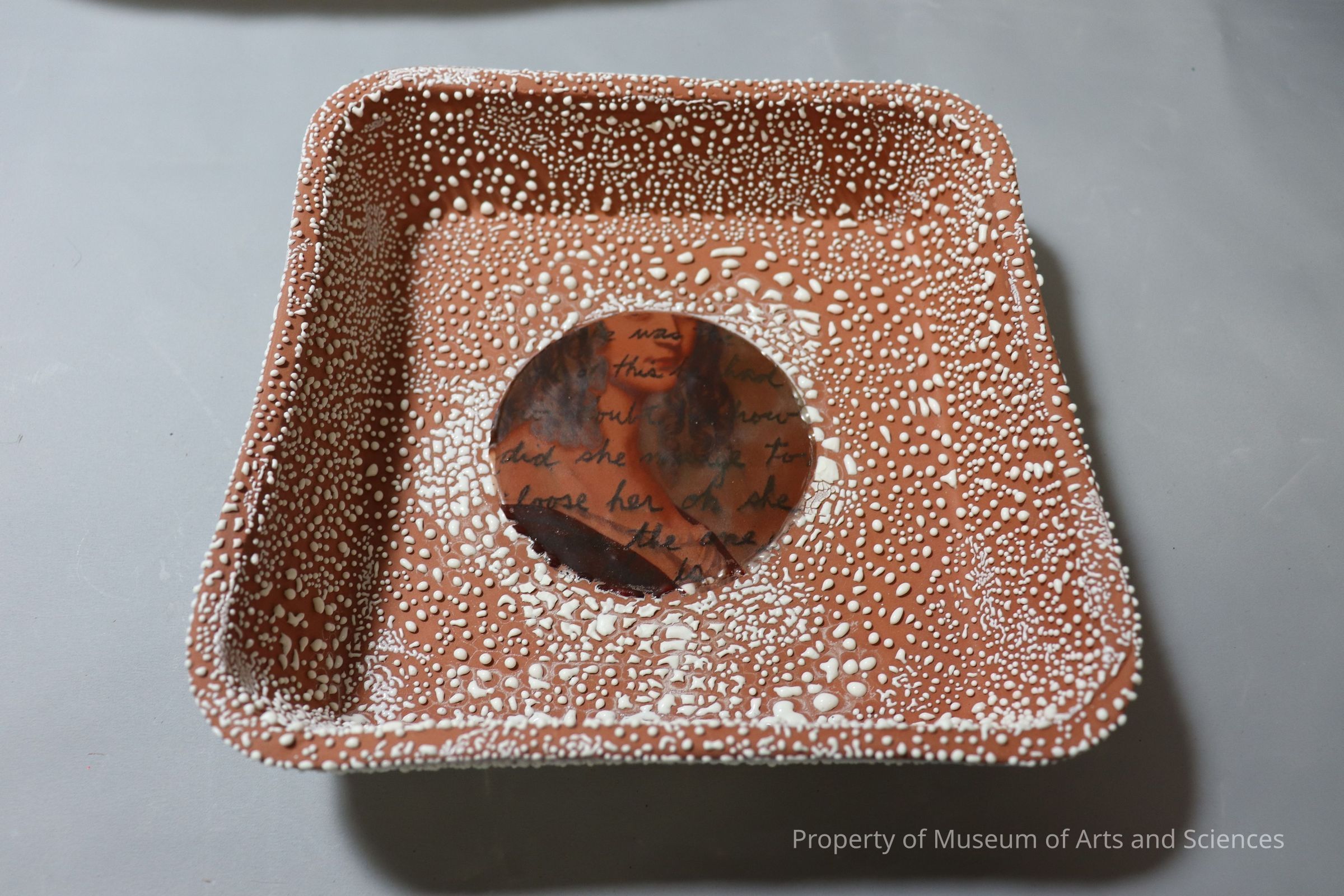 Square terracotta dish w/ white bubbled decoration. Circular painted appliqué in center