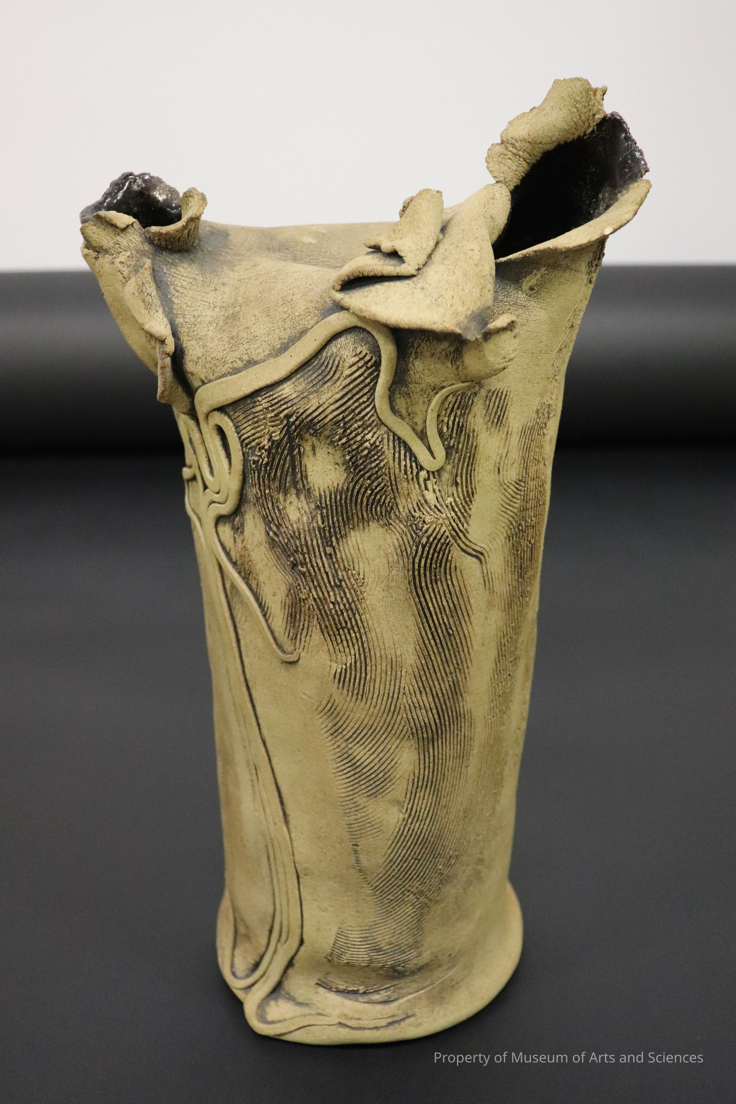 tan distorted cylinder with an oval open rim.Adorned with undulating cords and applied strips.Collection