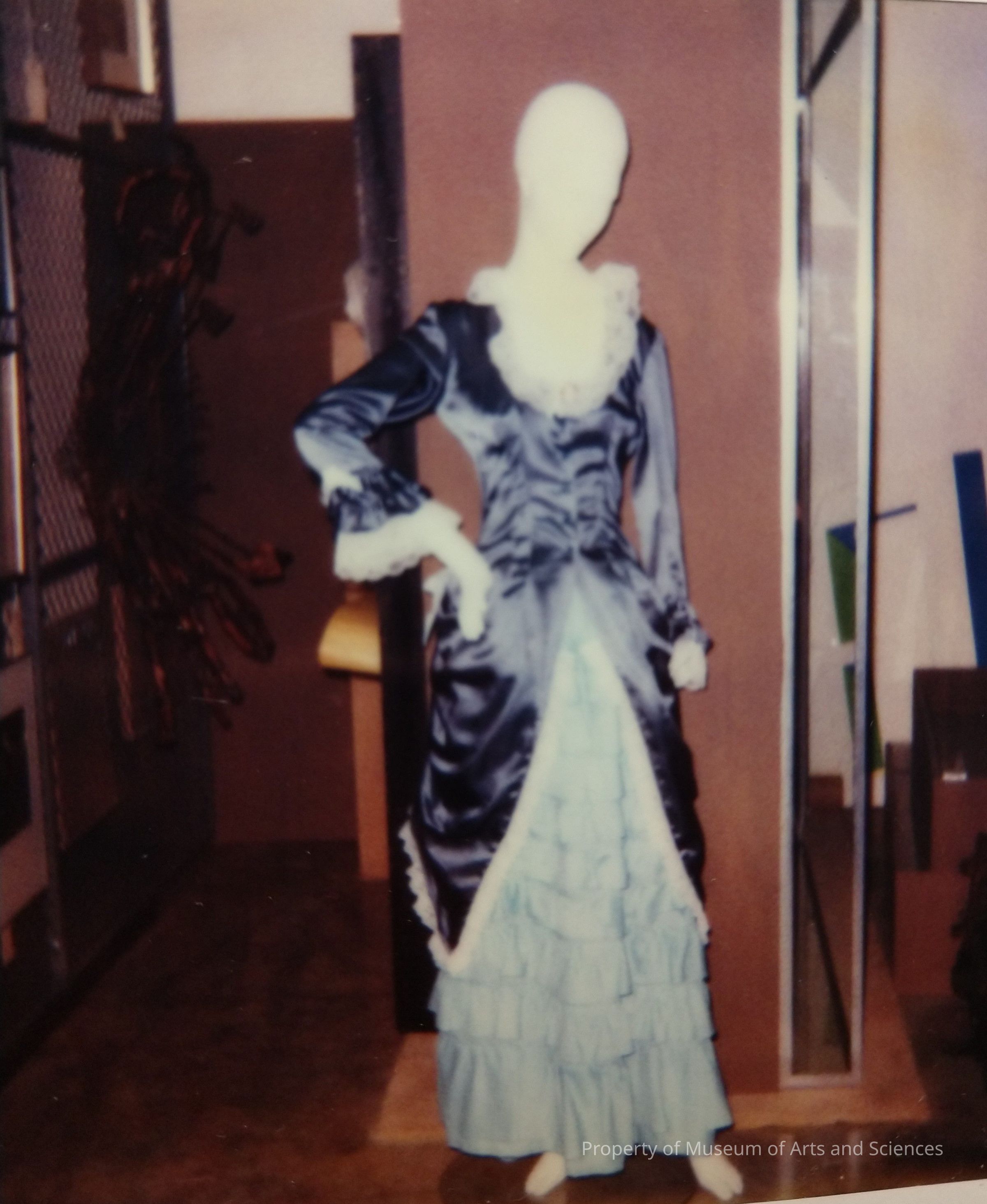 Pastel blue gathered broadcloth skirt has rows of ruffles. Grey-blue satin finish fabric with 3/4 length sleeves, over-jacket buttons down the front. Sleeves have two rows of satin fabric ruffled and a row of lace edging. The gathered lace edging around the neckline and a thinner width lace edging toward the bottom edge of jacket.Collection