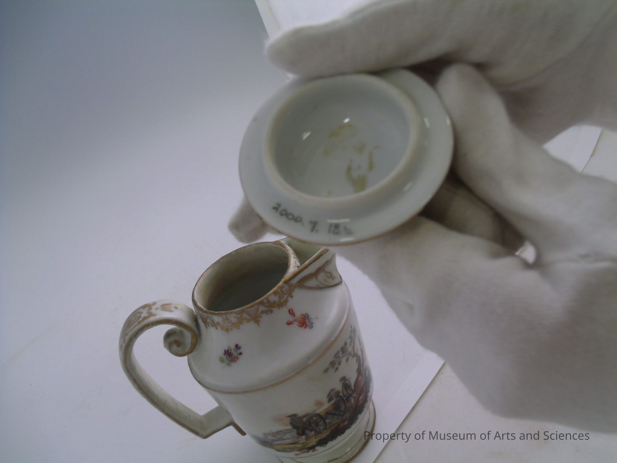 A Vienna covered creamer decorated with battle scenes; gilt trim on cover, spout, neck and handle.Collection