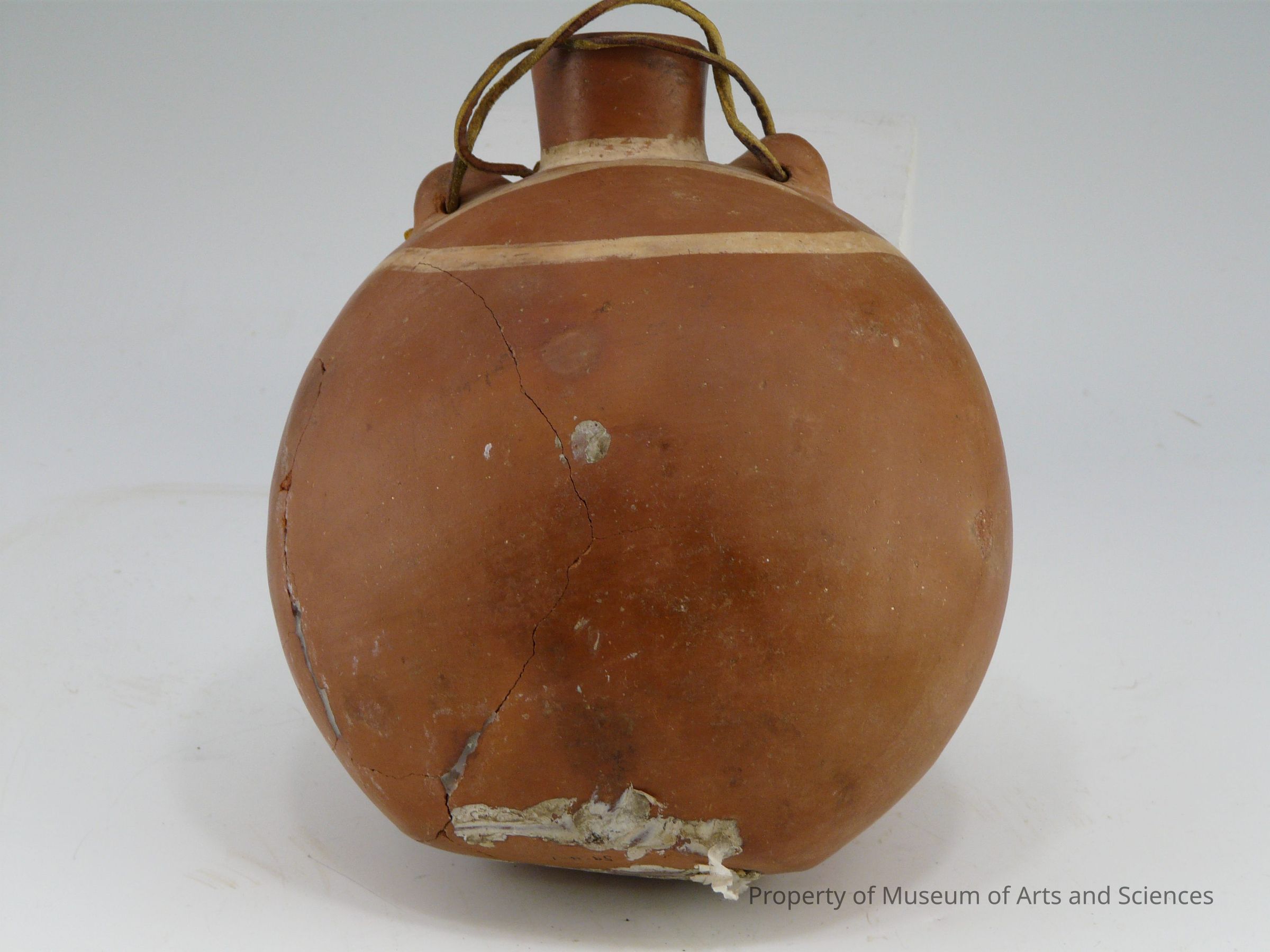 Bottle brown clay with white outline of monkey; 2 small handles on either side of neckCollection