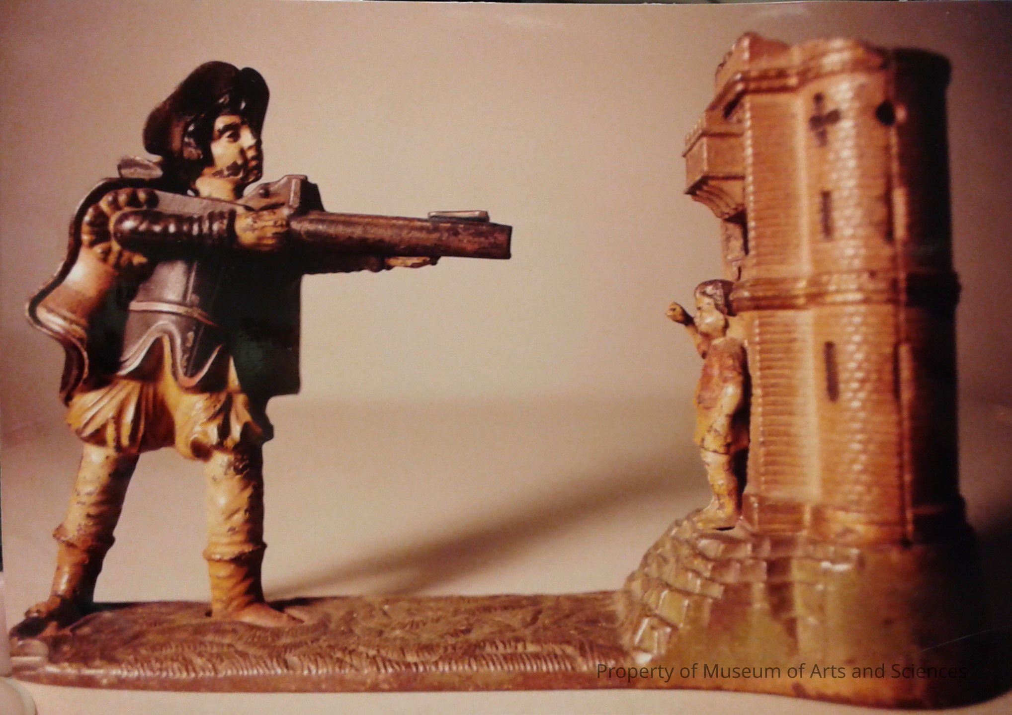 Press the right foot and the rifle shoots the apple from the boys head. As the coin enters the castle it stikes a gong bell. It is so arranged that a paper cap may be fried at the same time.