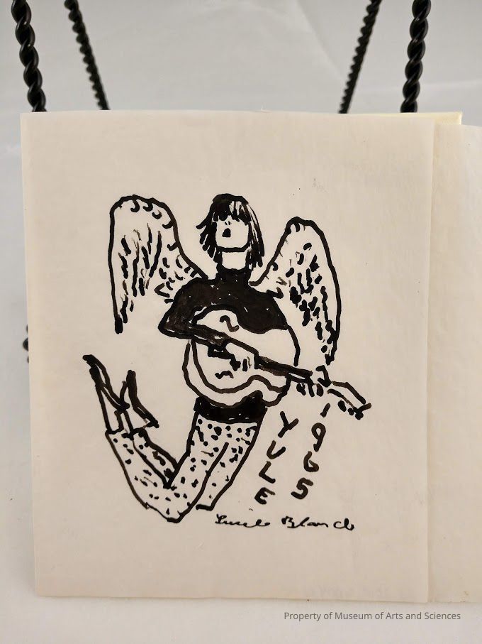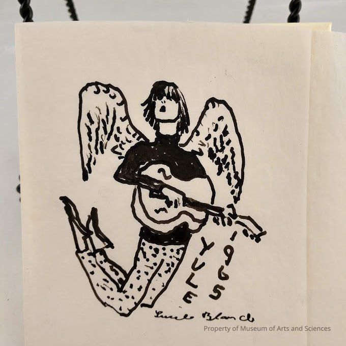 Black ink drawing of angel playing guitar with legs bent at kneesCollection