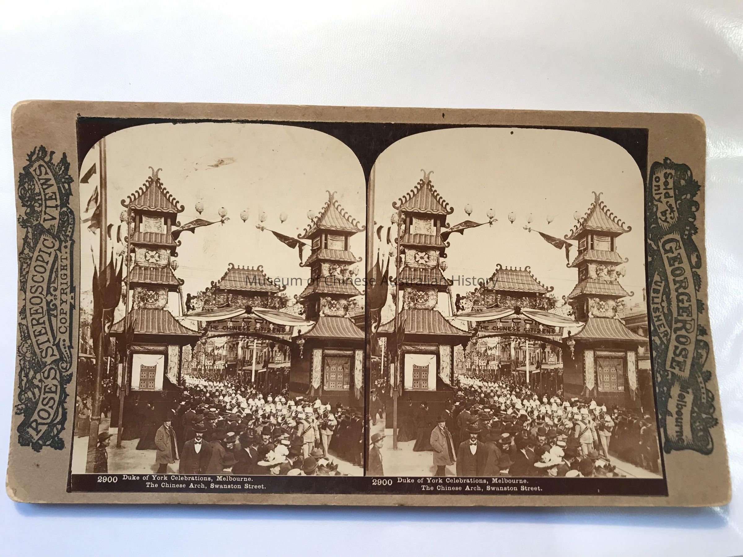 The two stereographs produced/ published by Rose’s Stereographic Views will be valuable additions to the series of historical photographs and postcards that are already in the museum’s collection (the ones related to the visit of the Duke, the Chinese Citizen’s Archway and the Chinese Procession happened on Swanston Street and Collins Street in Melbourne, possibly in 1901). The owner of Rose’s Stereographic Views- George Rose was a well-known Clunes-born stereographer. His photographic journey explores both Australia and the world. All his 3-D views were taken from the 1880s to 1920. There is no official number on how many of these stereographs George Rose had produced. Many stereographs depict the celebrations of the Duke of York’s visit to Melbourne (some could be found in the picture collection of the State Library of Victoria and the National Library of Australia), but the ones that depict the Chinese procession and the establishment of the ‘Chinese Citizen’s Arch’ are quite limited.