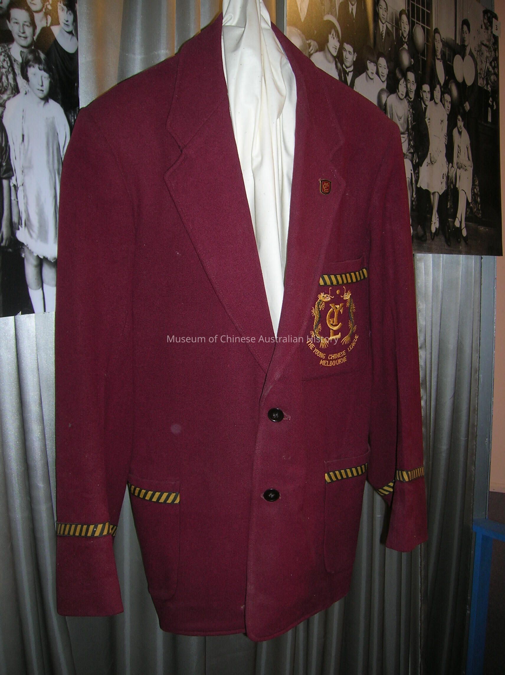 Les Youie recalls that the YCL first had these blazers made around 1956 when I was Secretary. We wore them to all YCL Official functions, particularly dinner dances and functions where we needed to let people know that the YCL had a strong input. Mainly committee members and footballers bought them. (email to Sophie 12 December 2009). They were first made for and worn at the Melbourne Olympic Games functions in 1956. During the Games, the Chinese (Nationalists) had a participating soccer team and the YCL entertained the team and officials while they were in Melbourne. The last time they would have been worn was probably at the end of 1978. This was the year that both Russell Moy and Les Youie decided to hand over the running of the YCL Annual Tennis Tournament to the younger members of the YCL. Les can't remember the blazers being worn after this time (email to Sophie, 13 December 2009).Acquisition
