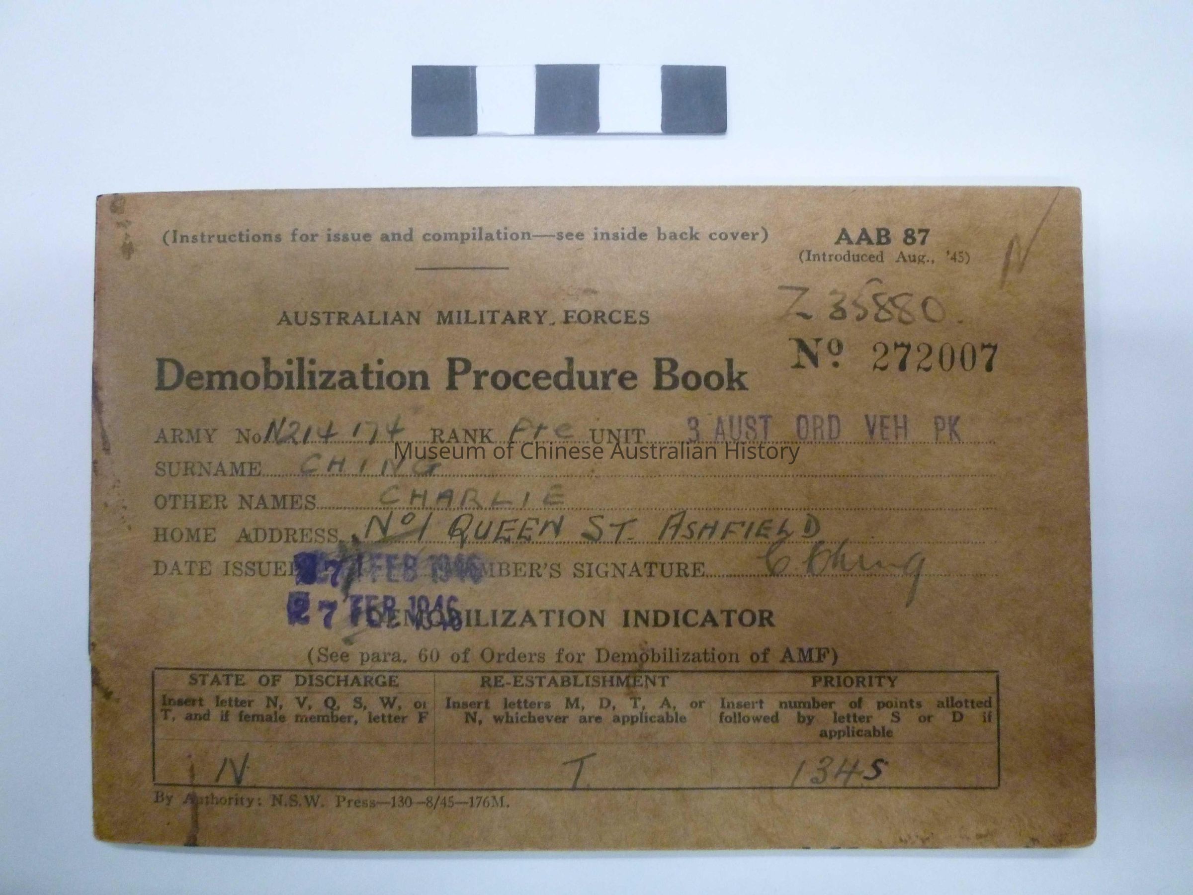 This material relates to the Ching Family. Florence Matilda Ching was the mother of Charles Ching and Allen Ching. Charles Ching served in the Australian Armed Forces during WW2. Charles Ching was a Private in the Citizen Military Force. He served from 1 Dec. 1941-7 Mar. 1946.