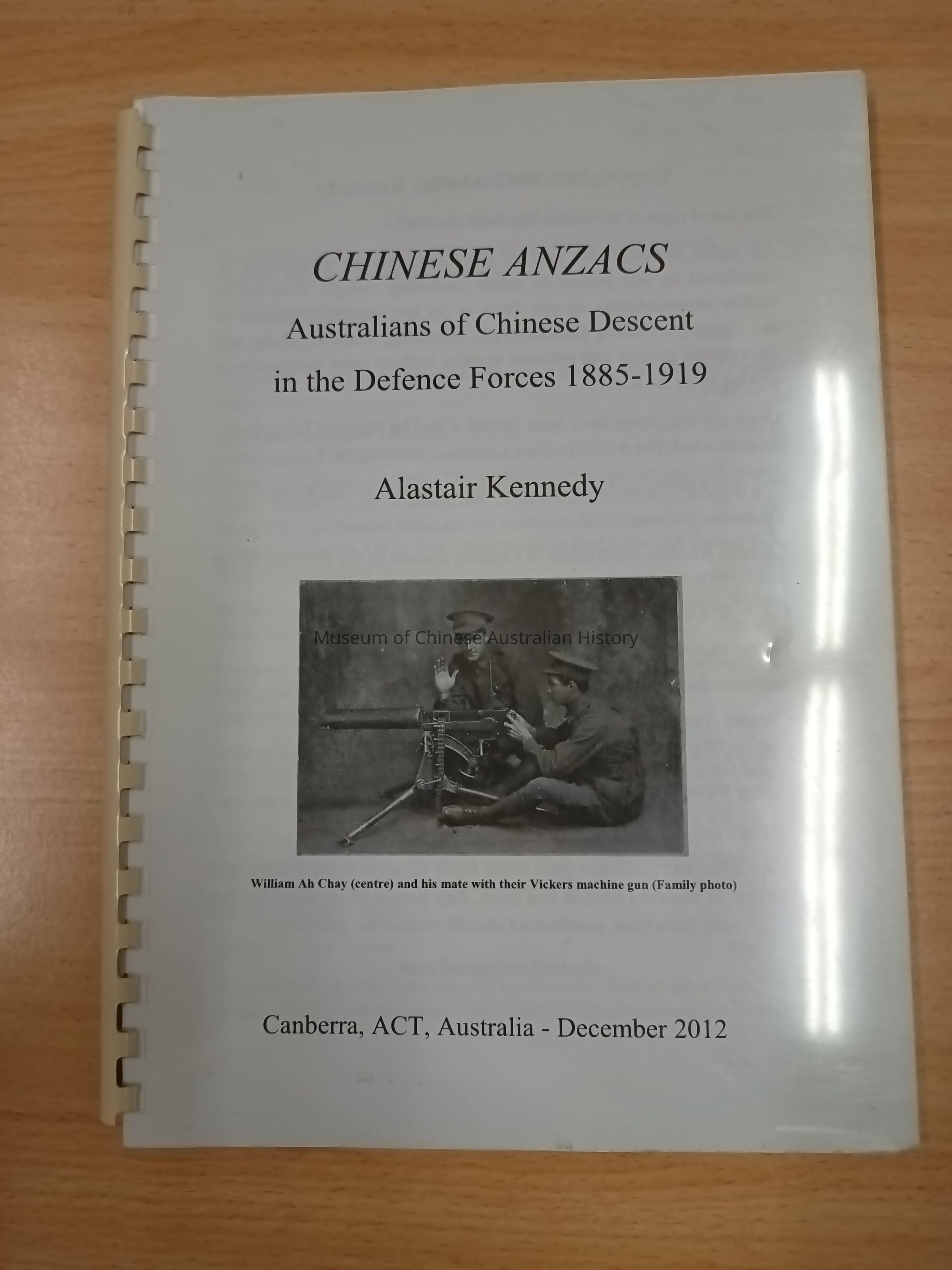 Donated by Alastair Kennedy, January 2013. Copies are available from the author, 31 Nardoo Crescent, O'Connor, 2602, Canberra (email: alastairken@gmail.com). See also 2nd ed. revised to include New Zealand-born Chinese of the New Zealand Expeditionary Force 1914-1919, F940.315 KEN.
