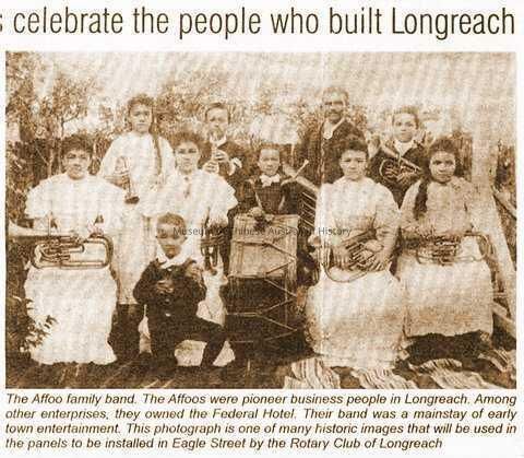 Historic: These photographs are linked to the Ah Foo (Affoo) family of Queensland. It is not known when Jimmy Affoo arrived but he was the proprietor of a boarding house and market garden in central Queensland by the 1860s. He married Evelina Vessey from Lincolnshire in Rockhampton and after living in Springsure were lured to the goldfields of Charters Towers and the Palmer River in 1873. In 1877 when the gold rushes declined, they returned to Springsure where they ran the Post Office Hotel, then the Carriers’ Arms, the Springsure Hotel (Springsure), Springsure Hotel (Barcaldine), Federal Hotel (Longreach). They had a family of thirteen children who were all highly musical and they formed the Affoo Family Band which toured the district. Kevin Rains has recently published a book on the history of the family which is held in the Museum’s library.