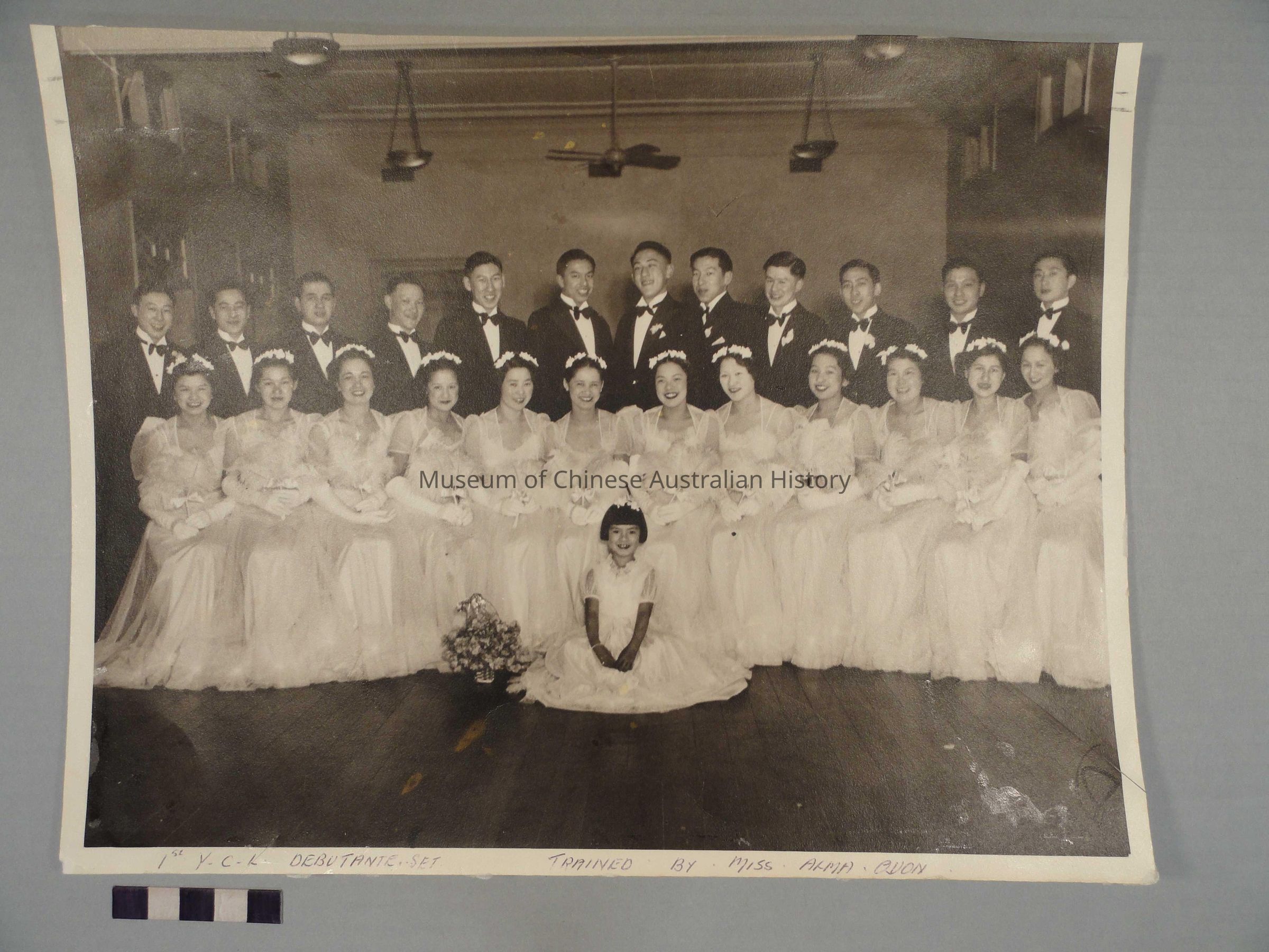 Vintage Photographic Print of the Young Chinese League debutantes, c. 1938. Handwritten ball point pen caption: '1st Y.C.L. DEBUTANTE SET TRAINED BY MISS ALMA QUON'. Detatched handwritten caption (from original card mount?): '1938 Y.C.L.DEBUTANTES SET PRESENTED TO MRS A. YOUNG & MRS W. CHUNG TRAINED BY MISS ALMA QUON'.