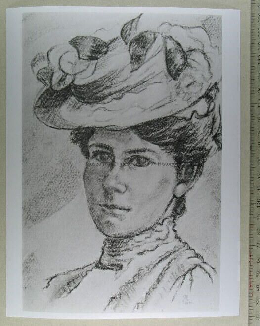 Picture of Gertrude Smith (1888-1979) in her wedding dress. She married Daniel Poon Num in 1908 at St Luke's Church of England, Whitmore Square. They had met when she was teaching English, and he was a student, at the Church of Christ, Grote Street. Gertrude's wedding dress was made from Chinese silk which her bridegroom Daniel had imported from China.