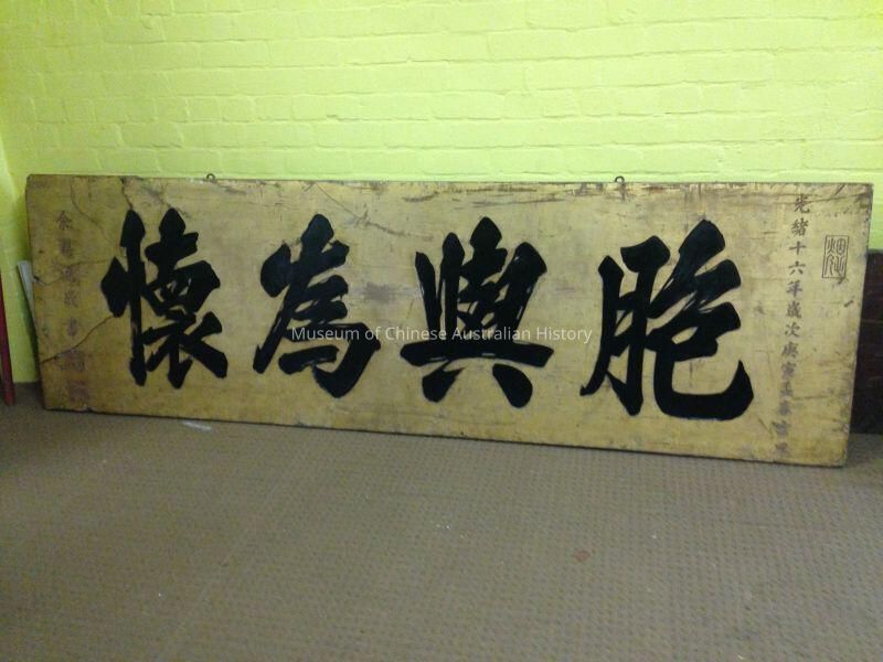 Historic: This wall plaque is believed to have hung on the front of the old Kong Chew Society building at 242-244 Little Bourke Street. The building was demolished in the 1970s. The date of the plaque is written down the right hand side (16th year of the Guangxu emperor = 1875 + 16 = 1891). A rough translation of the four main characters is: ‘Take care (look after, protect, nurture) the prosperity of your brotherhood (clanspeople)’. The society also still hold: couplets that sat on either side of altar, candle holders for altar (not full set), wall couplets believed to have been on outside of this plaque.