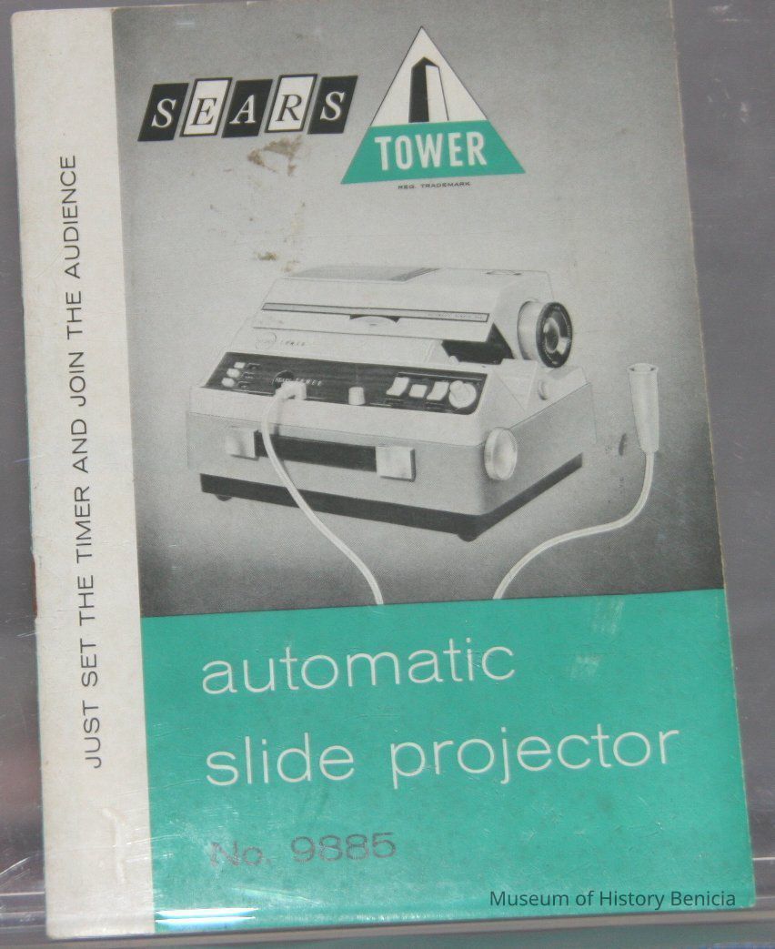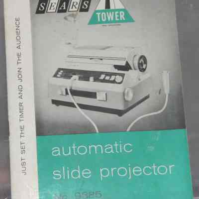 Instructions for Sears & Roebuck slide projector with plastic case. #9880 Tower projector. model 804.7201531. Contained slide tray with slides in it. Gave to Roberta to accession the slides under photographs.Collection