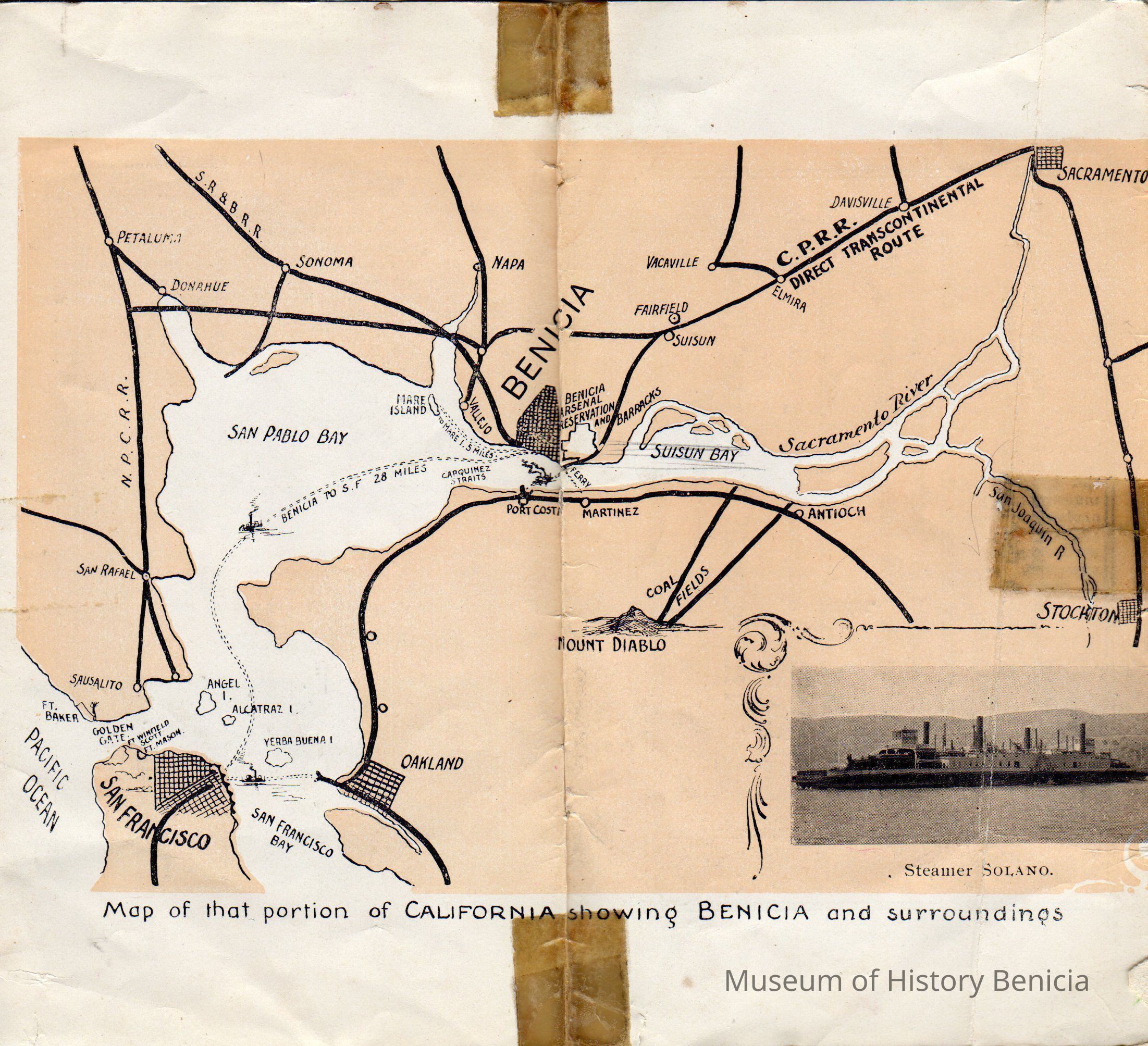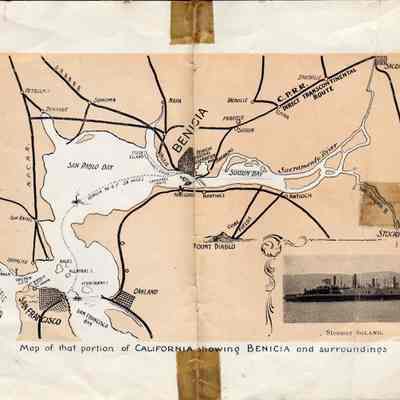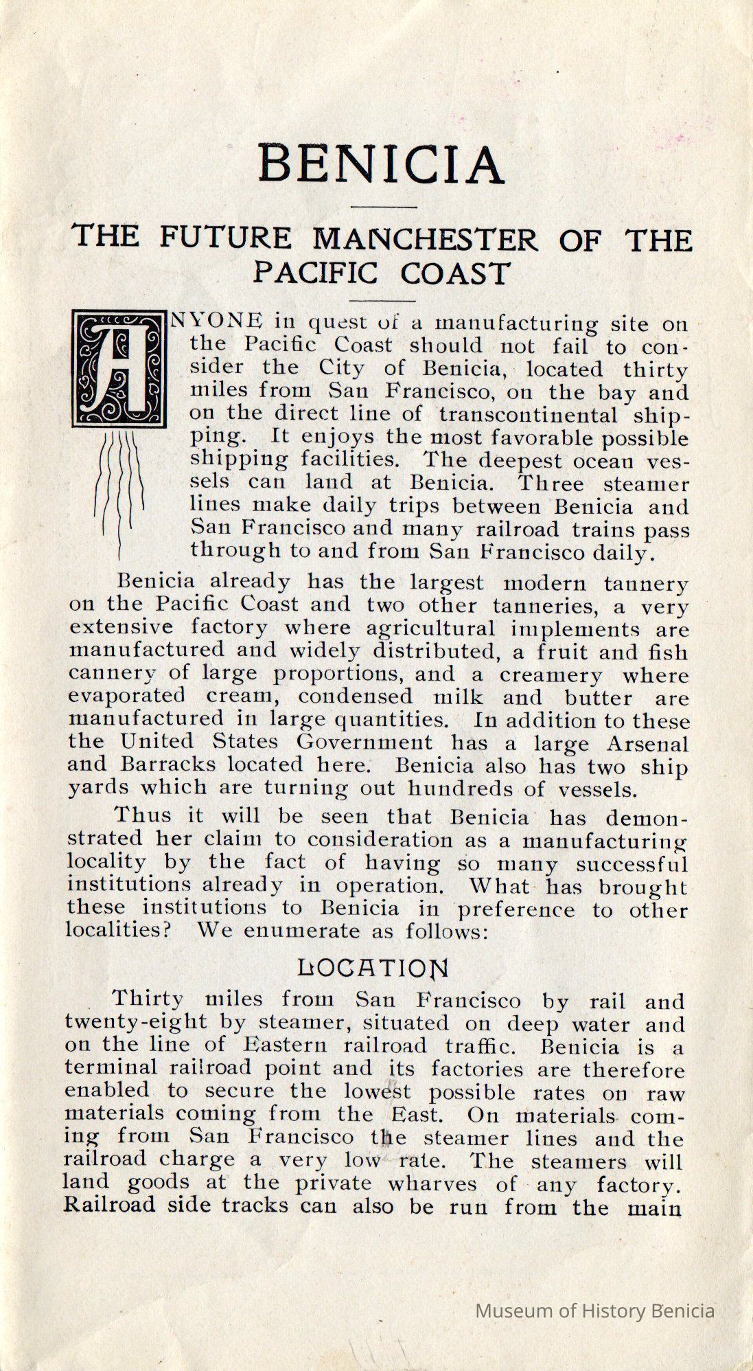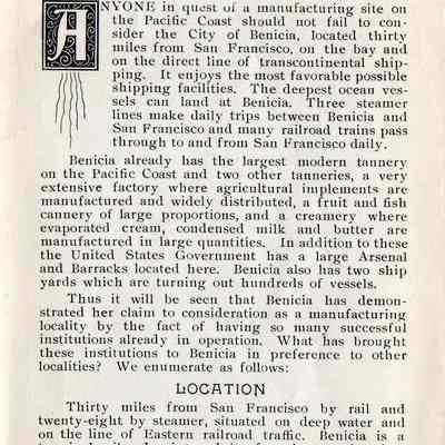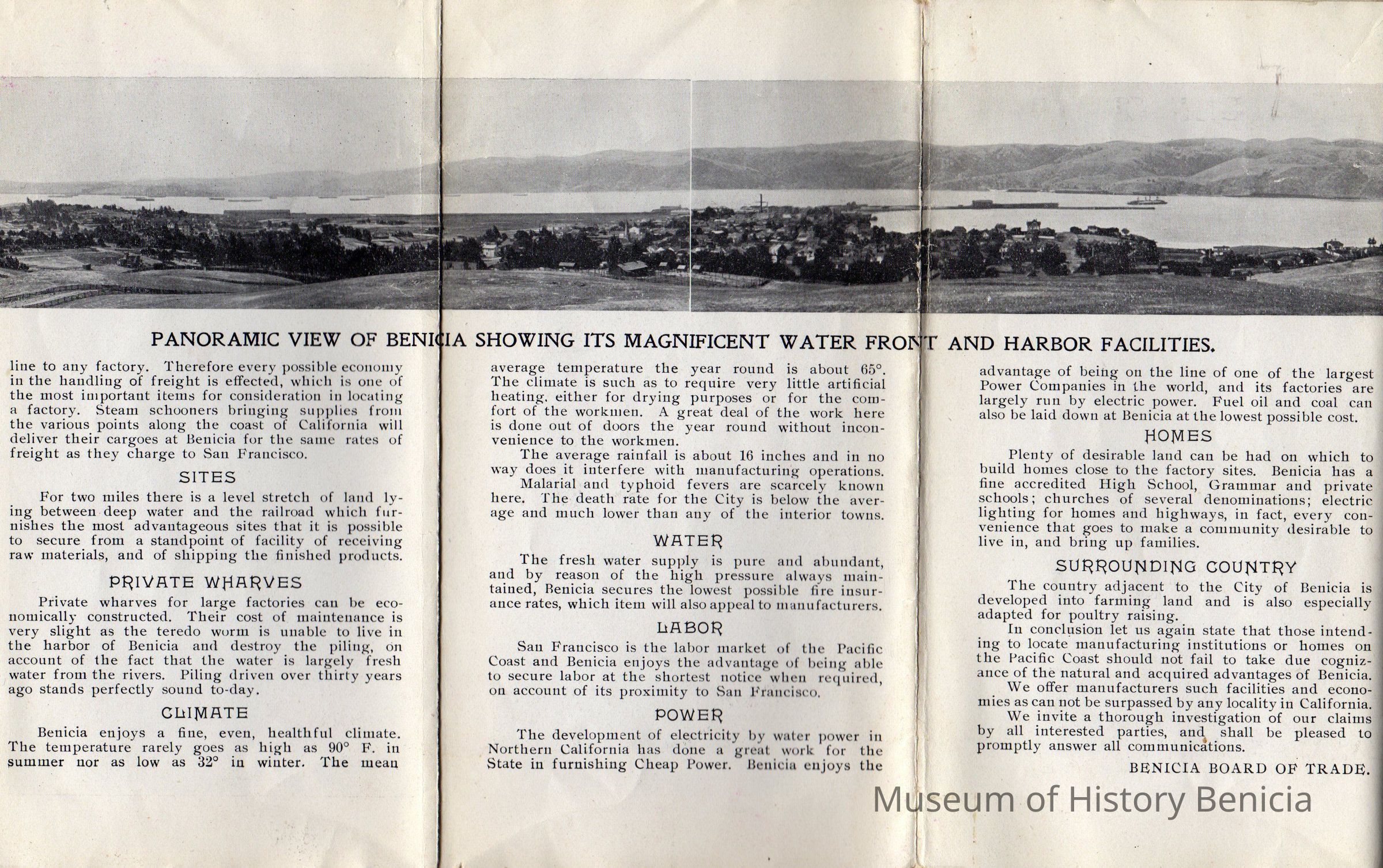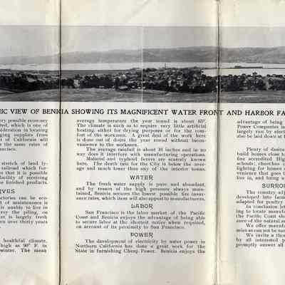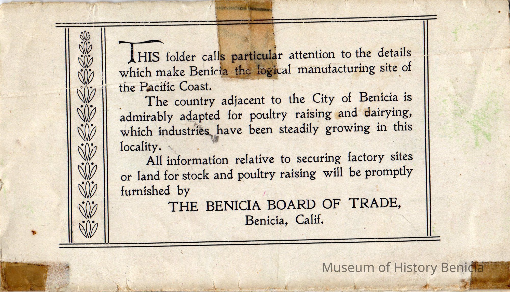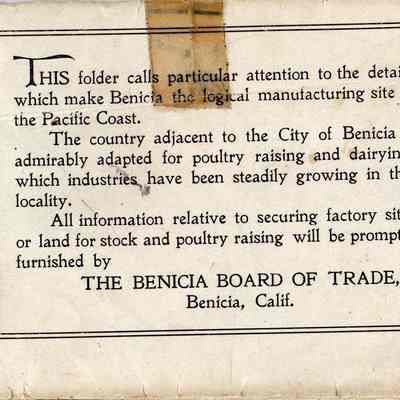 The front page reads " This folder calls particular attention to the details which make Benicia the logical manufacturing site of the Pacific Coast. The country adjacent to the City of Benicia is admirably adapted for poultry raising and dairying, which industries have been steadily growing in this locality. All information relative to securing factory sites or land for stock and poultry raising will be promptly furnished by THE BENICIA BOARD OF TRADE, Benicia, Calif.Collection