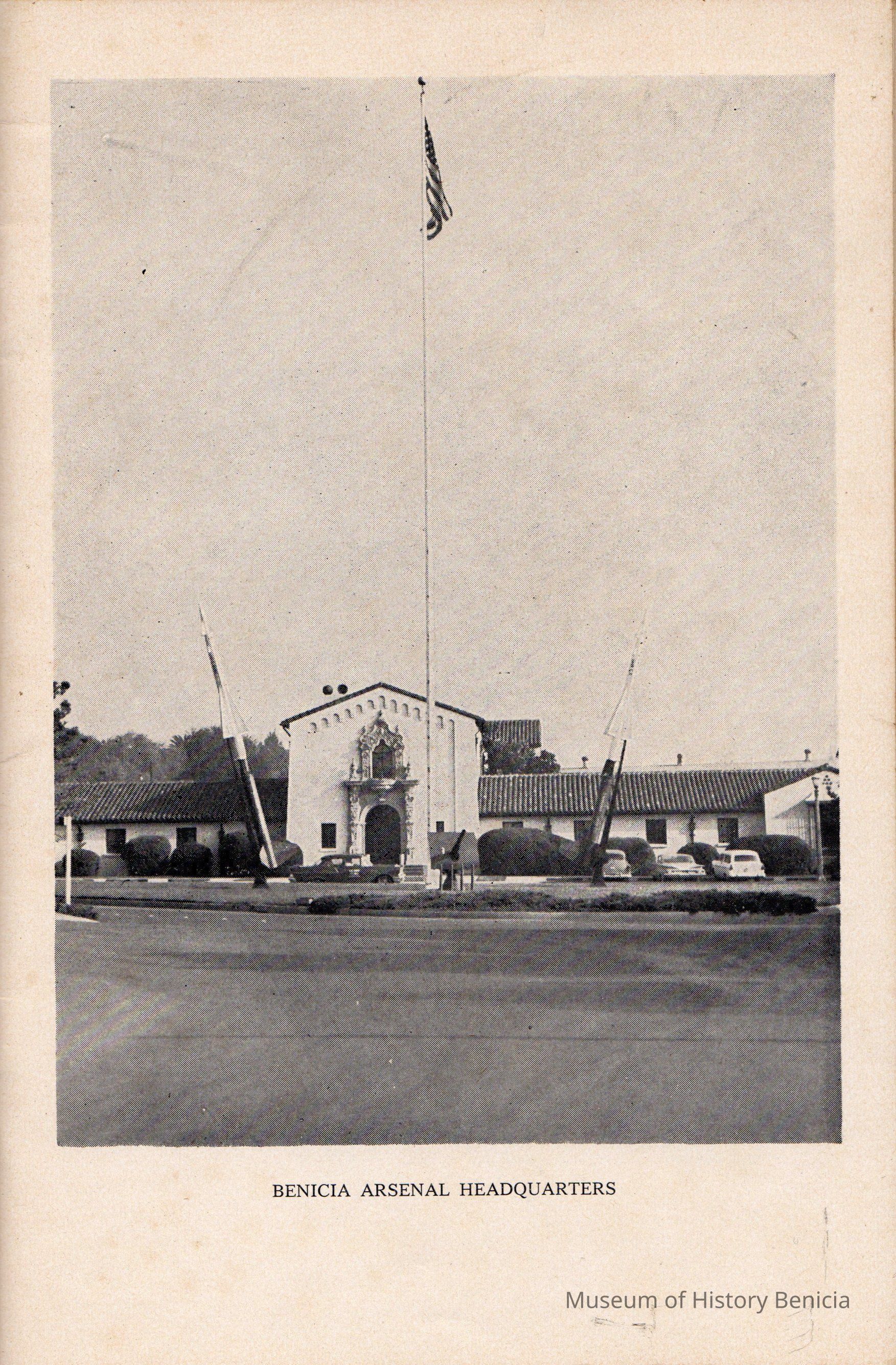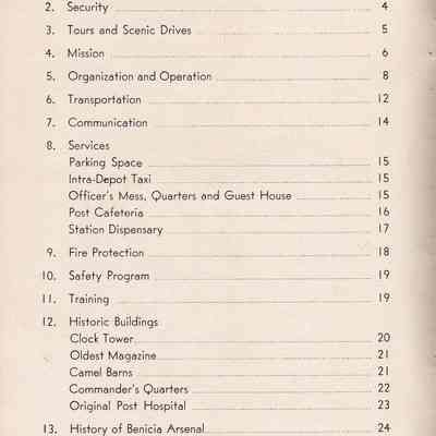 This booklet provides information about the Benicia Arsenal, information pertaining to its location, terrain, and climate, security, tours, mission, organization, transportation, communication, services, fire protection, safety, training, historic buildings, and the history of the Arsenal.