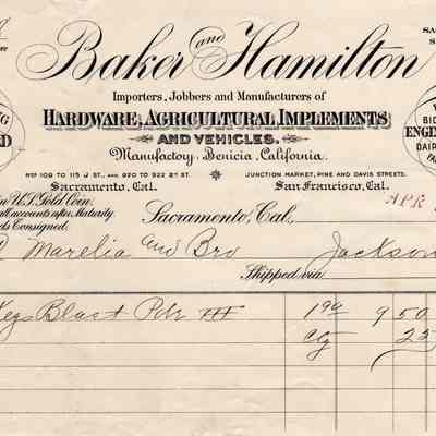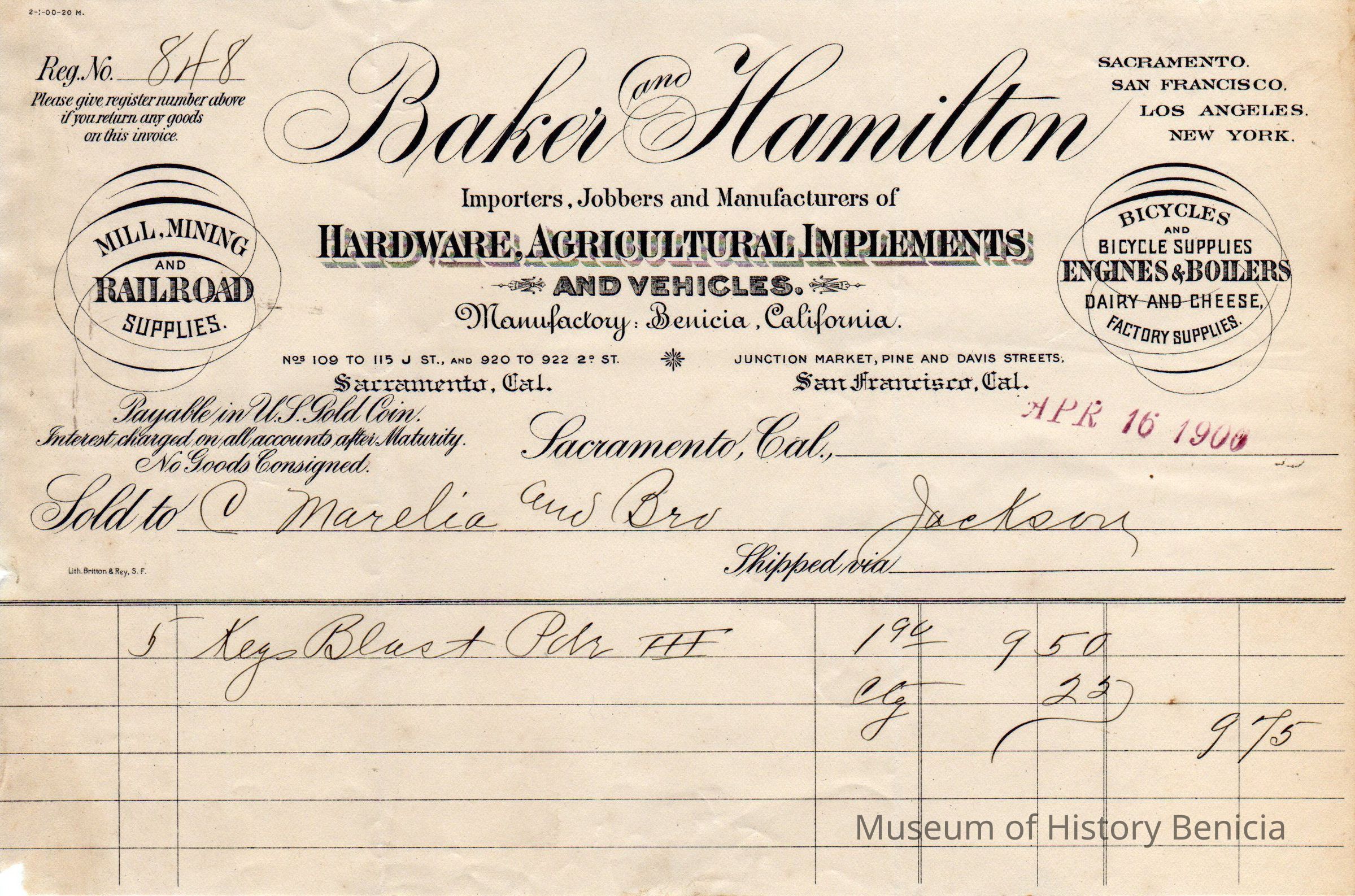 Baker & Hamilton Importers, Jobbers, and Manufacturers of Hardware, Agricultural Implements, and Vehicles. Manufactory, Benicia, California. Mill, Mining and Railroad Supplies.