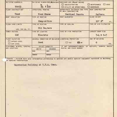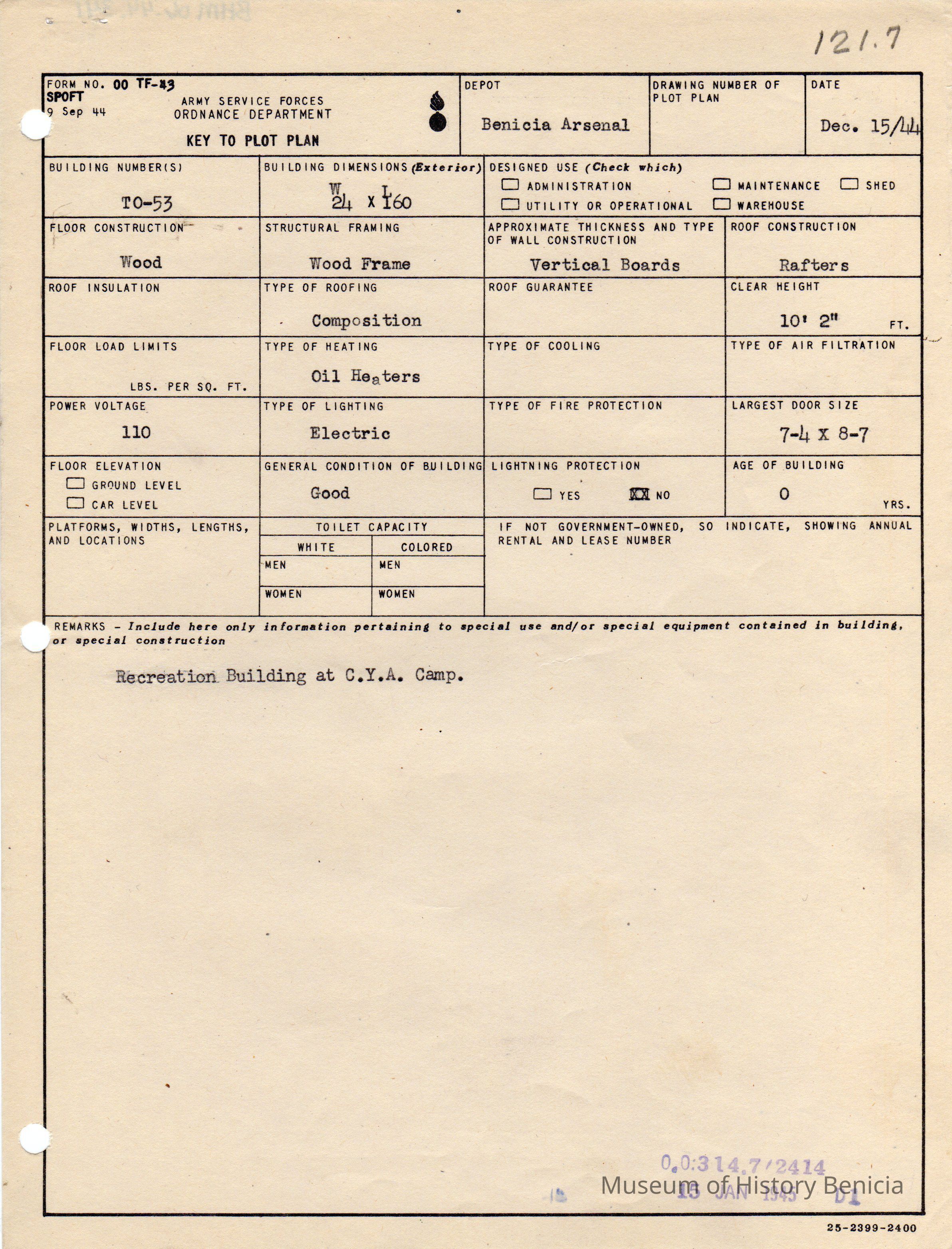 Benicia Arsenal Document. Form No. OO TF-43 SPOFT dated Dec. 15, 1944 Army Service Forces Ordnance Department, Key to Plot Plan Building TO-53 Recreation Building at CYA Camp.