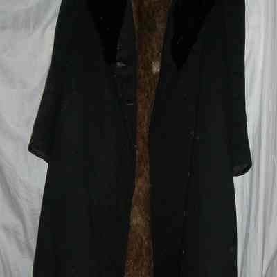 Coat, belonging to Lt. Champion, black wool, full-length; fur collar, two buttons on right sleeve; six button on front left, two large covered buttons on front right; lamb's wool lining; length: 49-5/8"; sleeve length: 25-3/8"; waist: 21-5/8" (buttons missing from left sleeve)