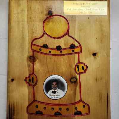 Wooden award with large red fire hydrant etched in the middle. At the top right is a brass plate and in the lower area of the hydrant is a plastic button.
