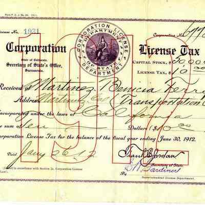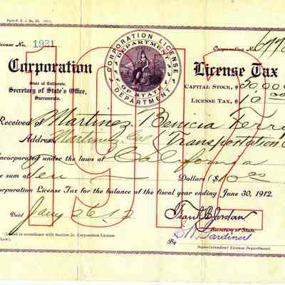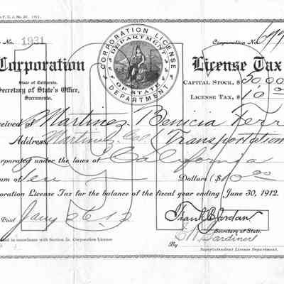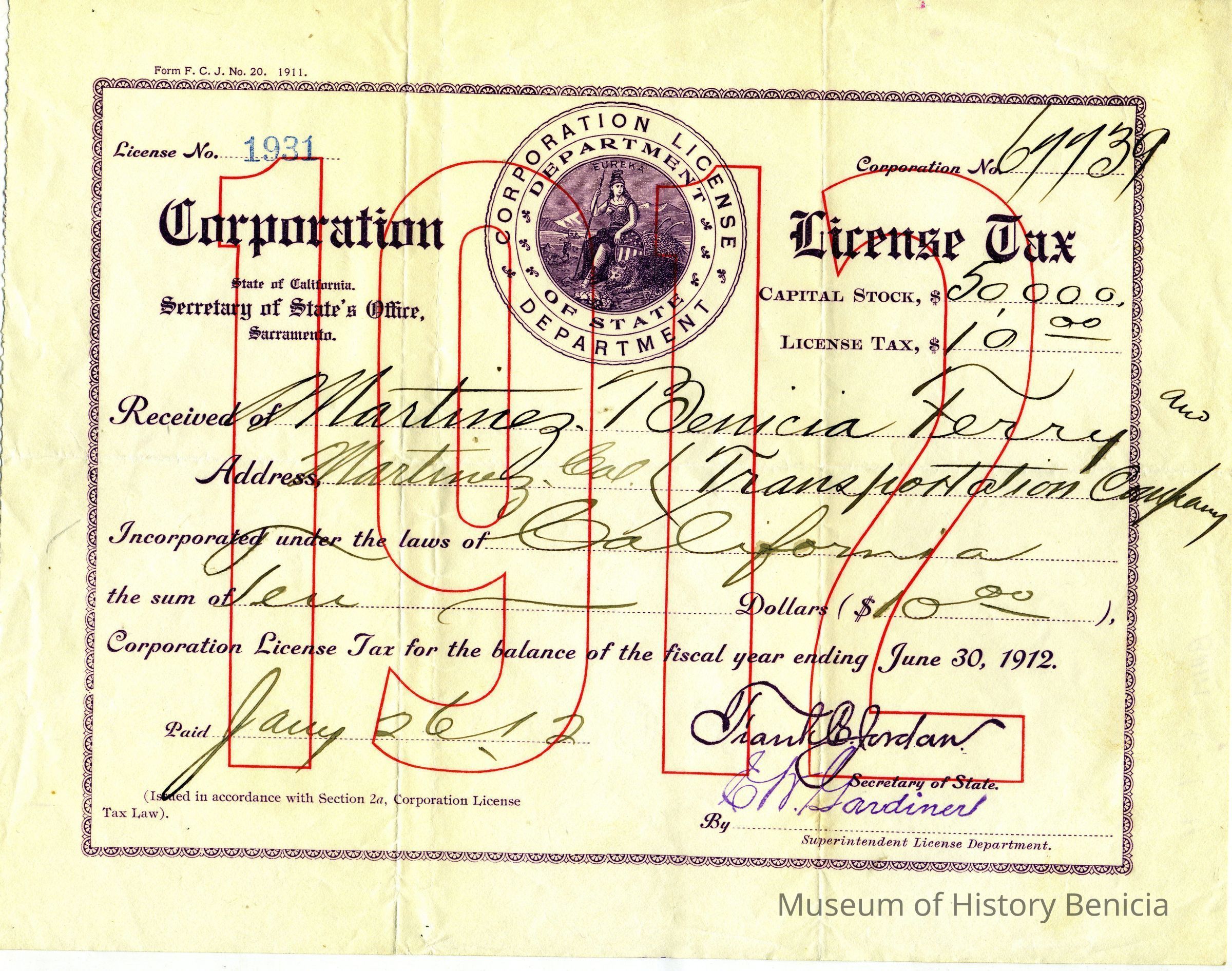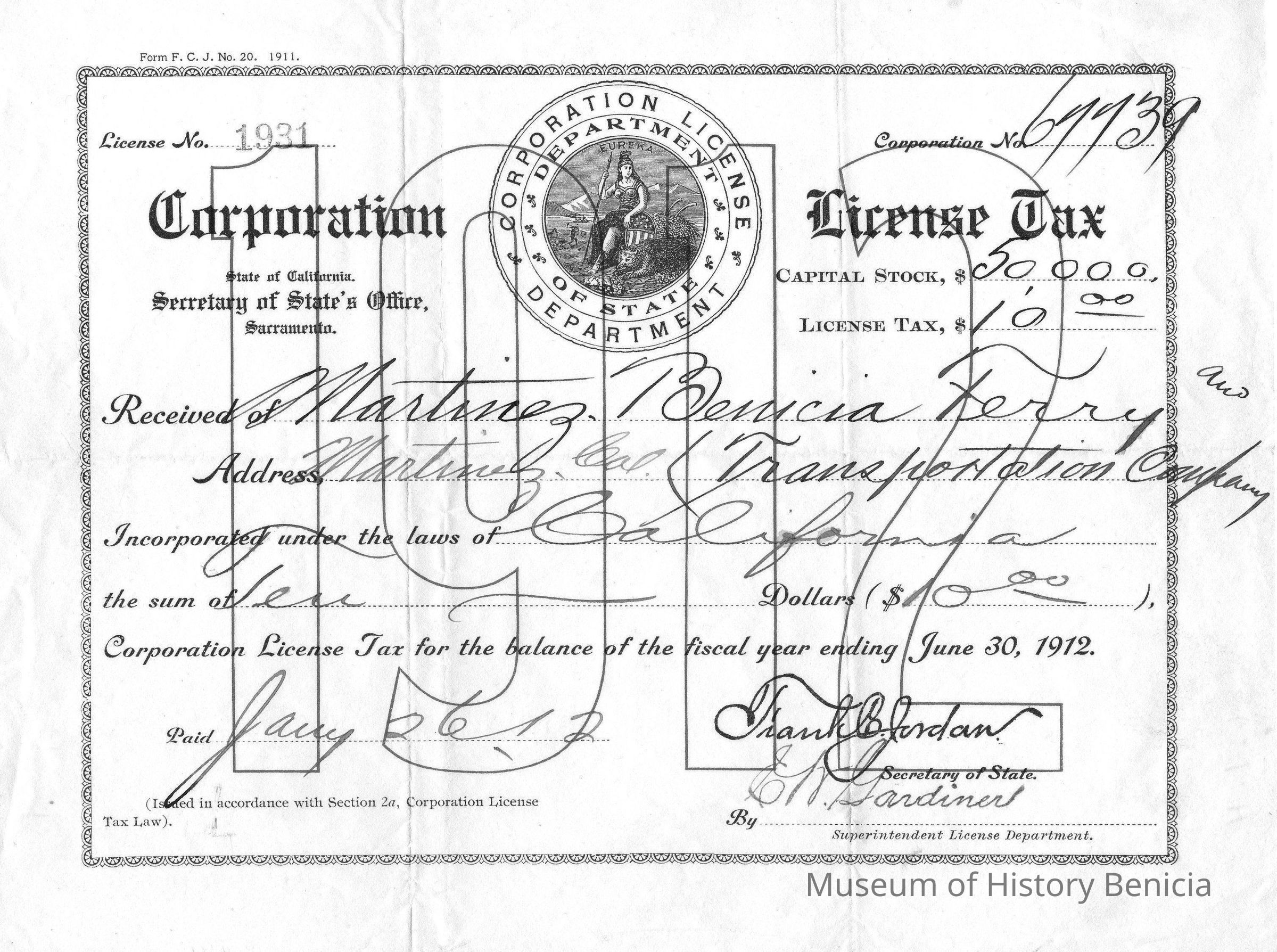 Corporation License Tax from the Secretary of State's Office, Sacramento, California. License No. 1931, Corporation No. 67739. Received of Martinez Benicia Ferry, Martinez, California Transportation Company. Capitol Stock: $50,000.00. License Tax: $10.00. Paid January 26, 1912. Corporation License Tax for the balance of the fiscal year ending June 30, 1912.Collection