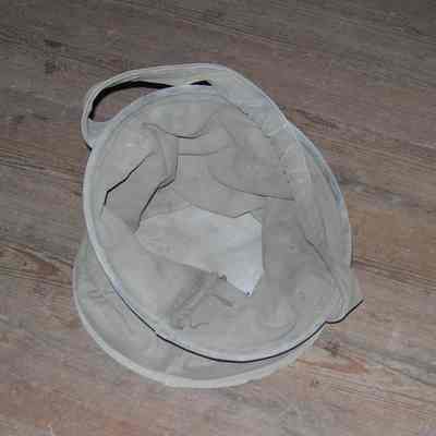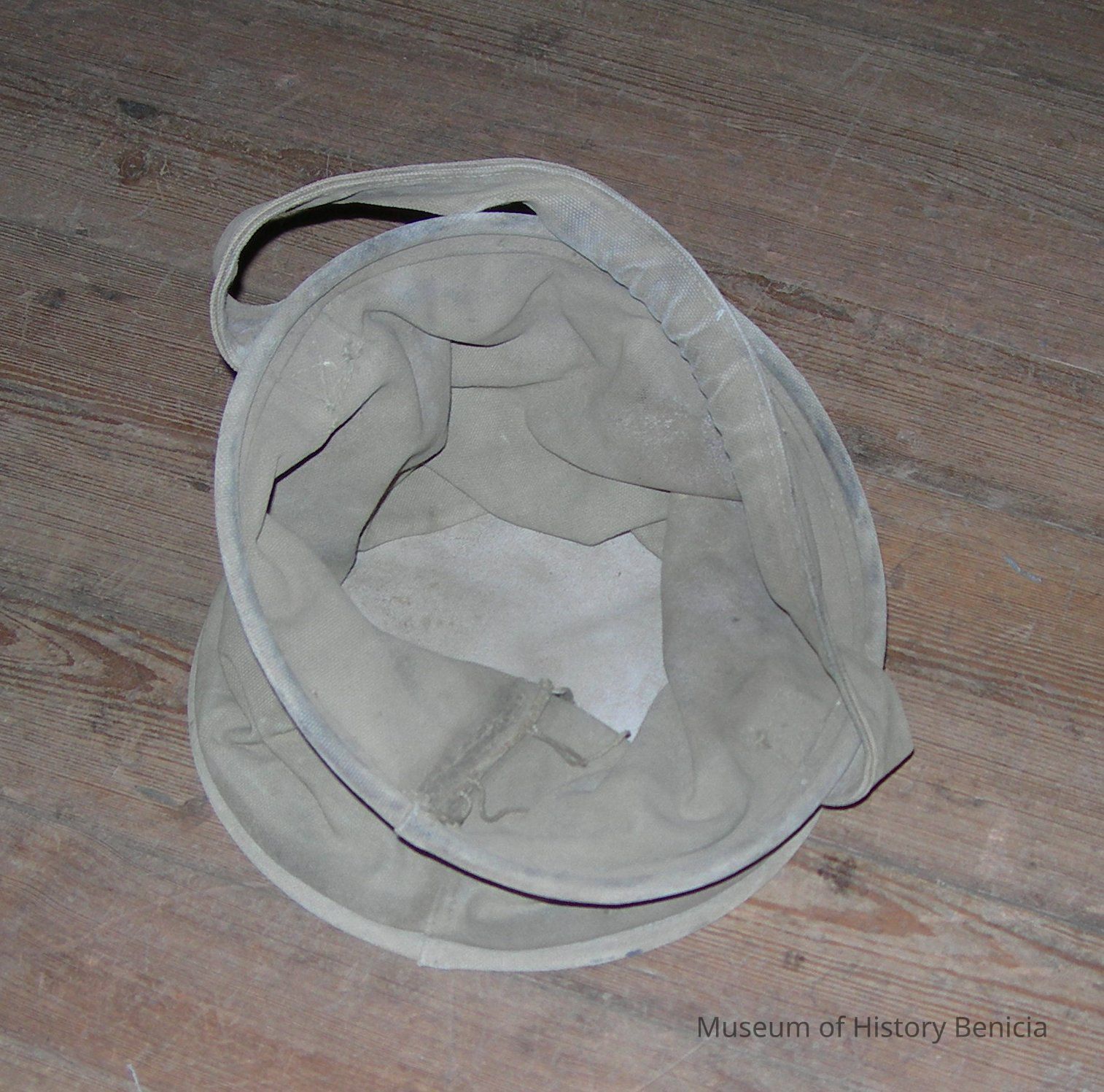 Round bucket with collapsible green canvas sides. Stiff ring around top and bottom; padded canvas handle; "U.S." stenciled on side; US Army issue
