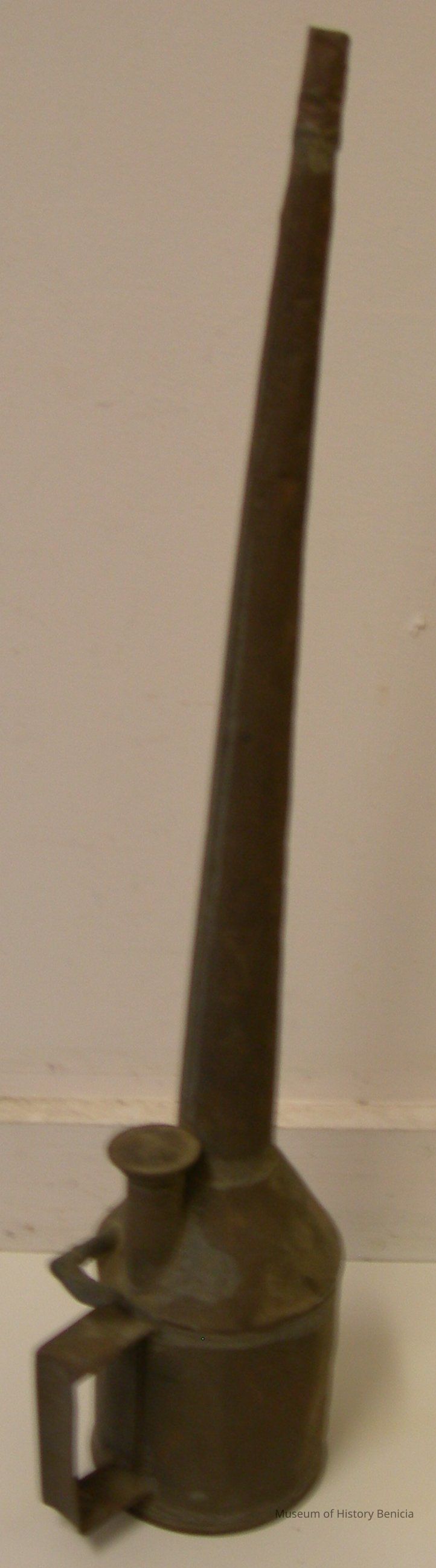Railroad oil can, with handle and long extension for use with machinery that is hard to get to; has screw top to allow for adding the oil and a lever to control the amount released;