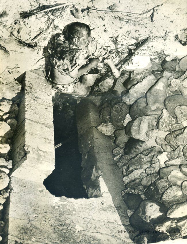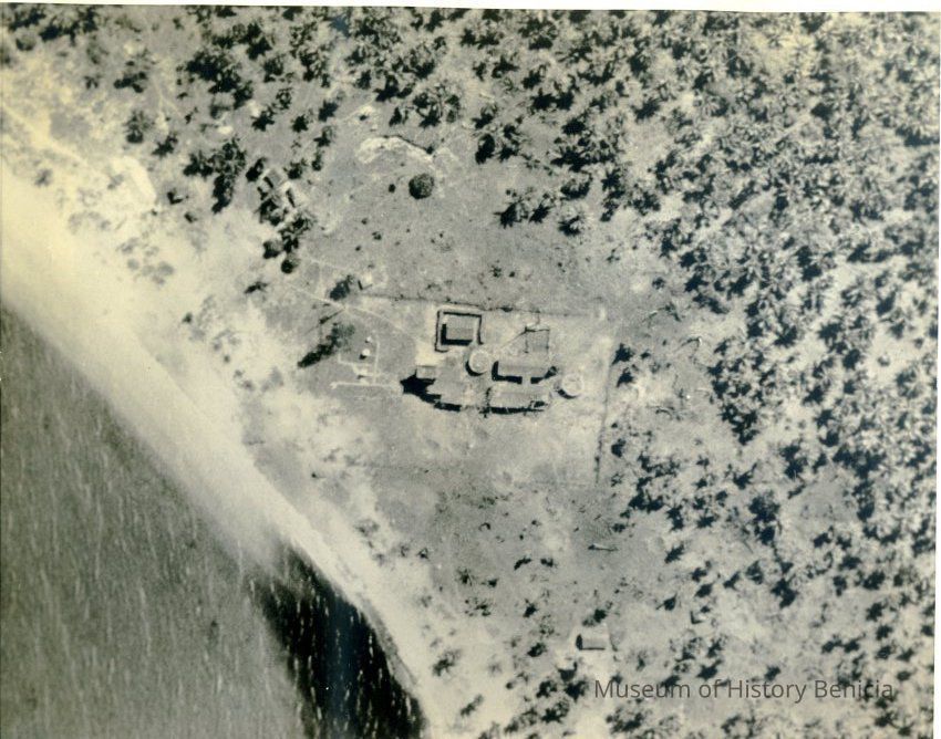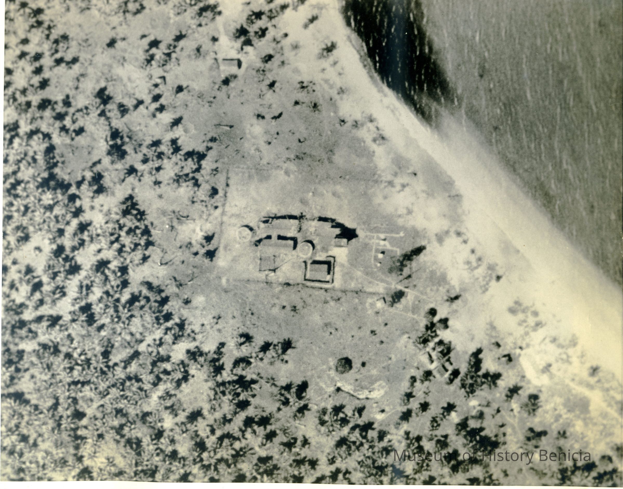 This page shows two photos. One shows a Japanese soldier who has been killed by shellfire of his pillbox on Ebeye Atoll in the Marshall Islands. The other shows the aftermath of a Japanese station after bombing bt American Liberators on Marshall Islands.Collection
