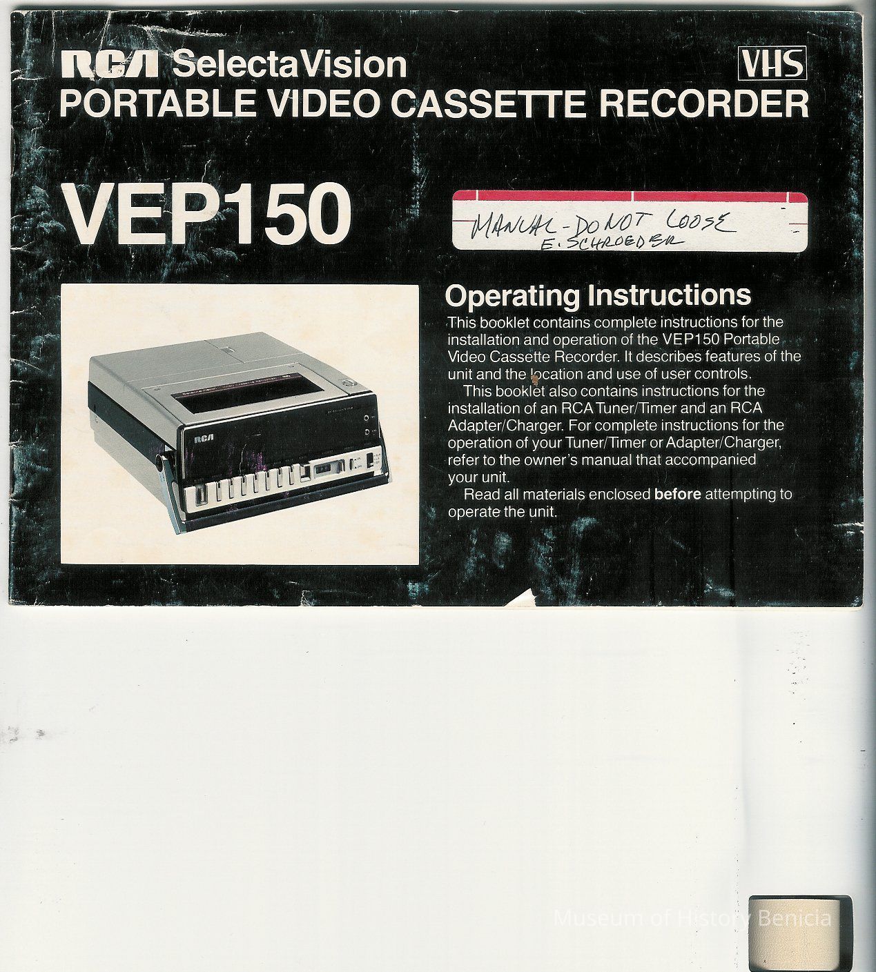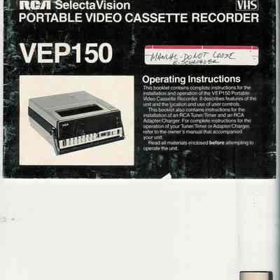 Operating manual for VEP150 video cassette recorder "Selecta Vision" VHS portable recorder. Ser No 0175H0256. Unit works on 12 volt DC with battery, 12 volt auto battery, or 110 volts AC with adapter. Has adapter, extra batteries, manual, and case.Collection