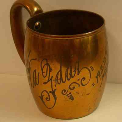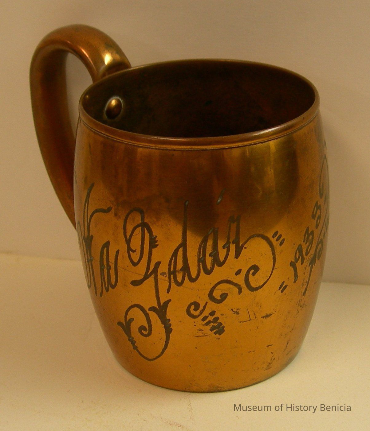 Slightly barrel shaped cup with large handle riveted on; etched on side: "Na Fdar 1933"'