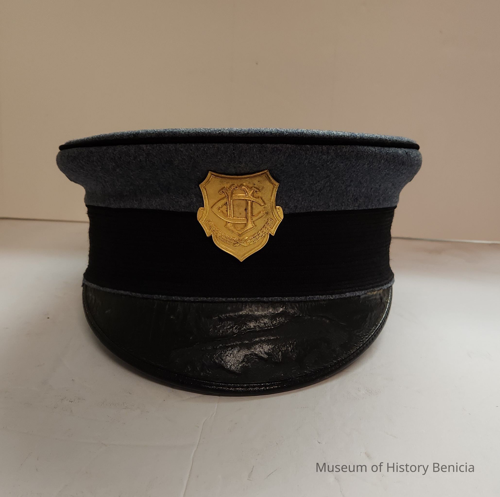 Gray Blue Military style cap from UC Berkeley ROTC, black band and visor, "UC" Insignia, size &, Cadet Air Force Hat.