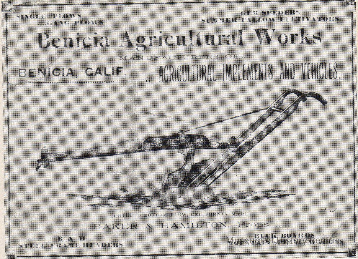 B/W Photograph of a copy of Benicia Agricultural Works advertisement. Site of Agriculture Works on previous location of Pacific Mail and Steamship Company. A picture of a plow is prominent.Collection
