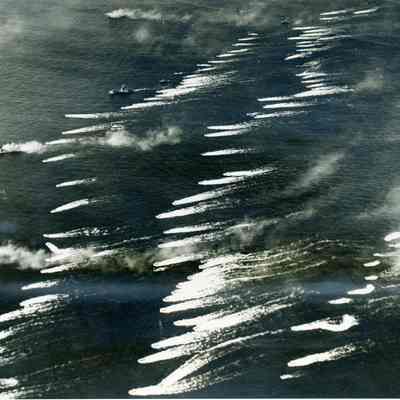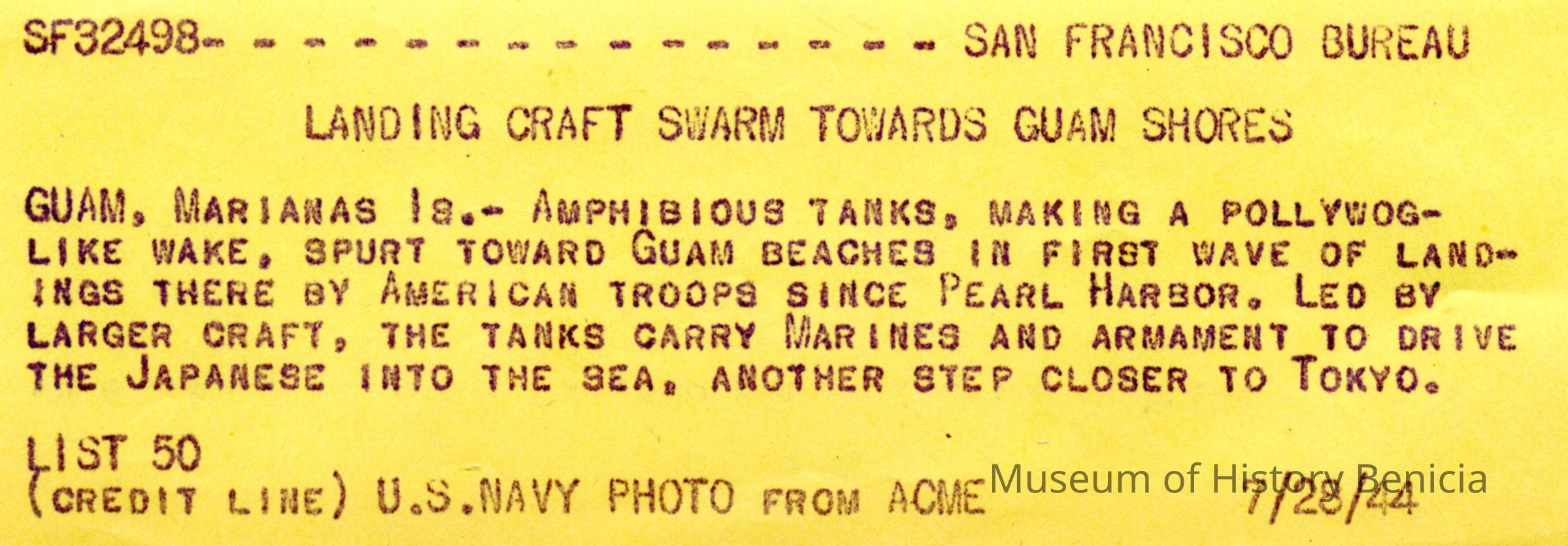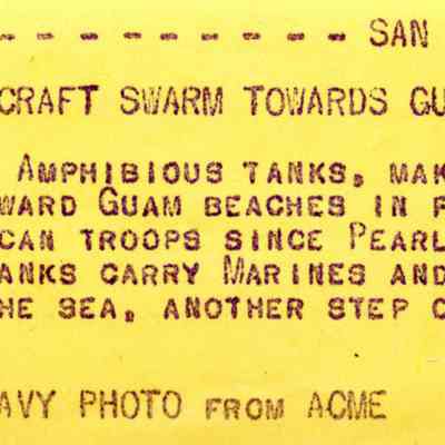 This is a loose photo that was at the back of the scrapbook. It shows American landing craft swarming towards Guam shores.Collection