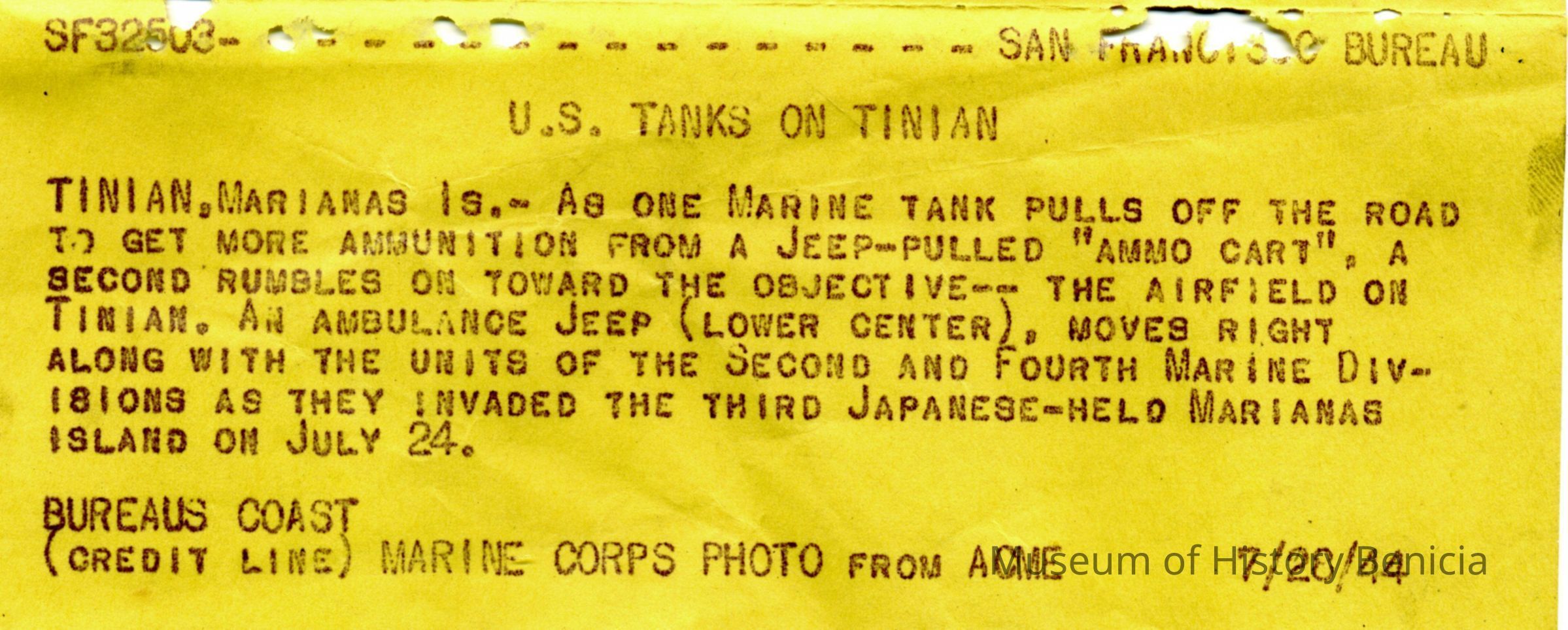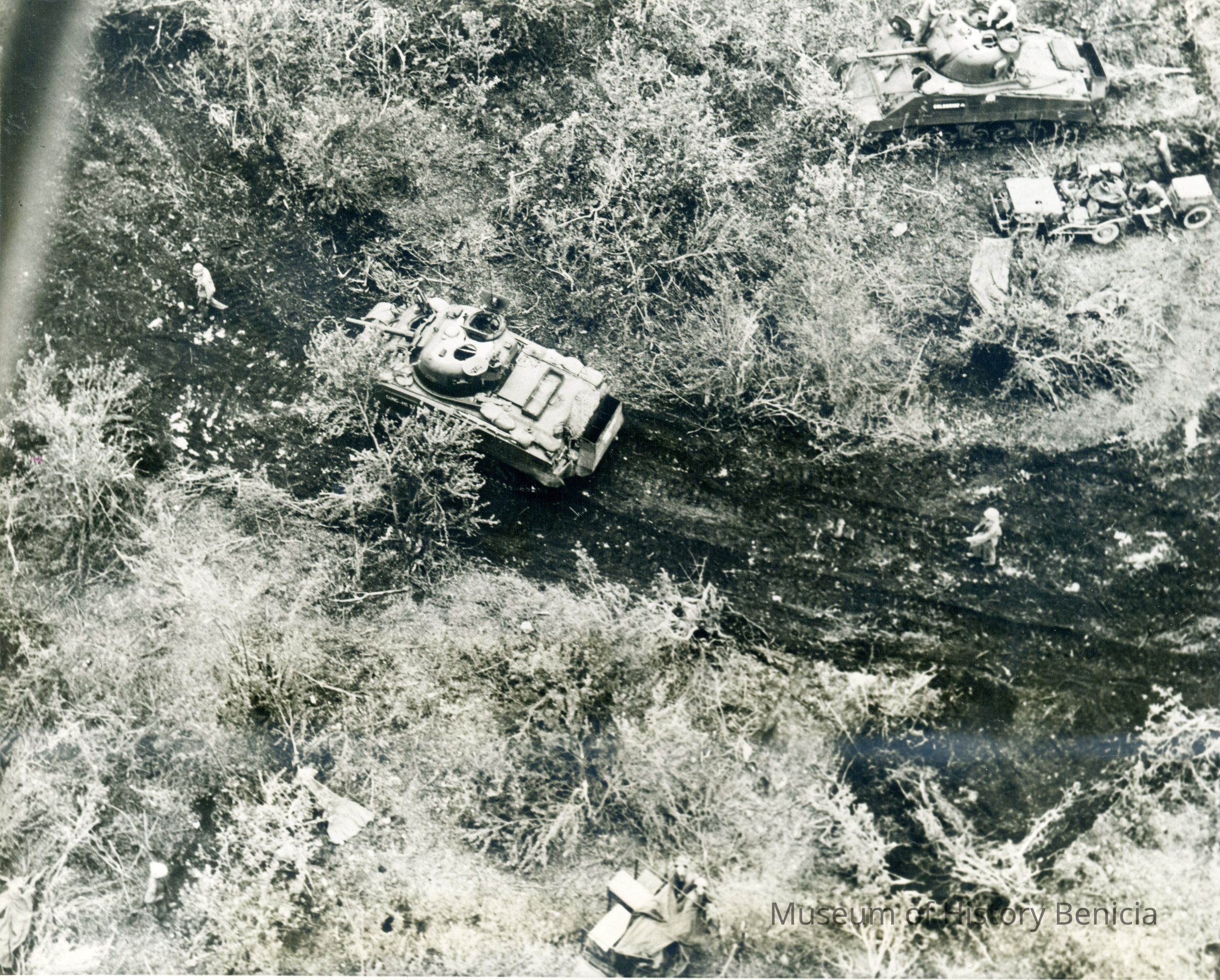 This is a loose photo that was at the back of the scrapbook. It shows tanks moving towards Tinian airfield in Marianas Islands July 24, 1944.Collection